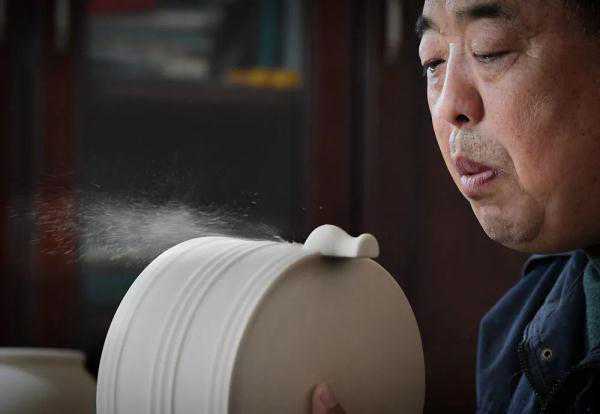 在位于河南省汝州市的一家汝瓷生产车间内,国家级非物质文化遗产汝瓷烧制技艺代表性传承人孟玉松在擦坯(2019年3月13日摄)。新华社记者李安摄