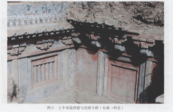 宋金时期仿木构砖雕墓,历年来在晋南一带多有发现,主要分布在稷山、侯马⑵、新绛、闻喜⑶和襄汾等地,夏县境内集中发现尚属首次。其中,上牛宋墓建筑手法独特,结构上不设棺床。三合院式仿木构建筑以北面为主,东、西两厢为辅,层次分明,具有浓郁的生活气息。斗拱形制规整,装饰华丽,棋头卷瓣、斗輙内弧明显,反映了早期建筑风格。且有准确纪年,为当地宋代墓葬的研究提供了标尺。