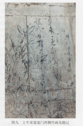 上牛宋墓为三合院式仿木构建筑。墓室四壁用条砖错缝平砌四层作为基座。基座之上,北壁中间以两根抹角方柱分隔成三间,正中辟门,门由门砧、门槛、立颊、樽柱、门额、上额、门簪和板门等组成。三枚门簪皆绘墨,中间一枚为圆形,表面为花瓣;两侧两枚为长方形,表面为米字纹。板门不分门扇,亦无门钉(图三)。西壁以四根抹角方柱分成三间,当心间辟门,门制和北壁相同,无门簪,但板门上有墨绘门钉,墨色已脱落,门钉数目不清。南、北两稍间各砌置破子根窗,高0.57、宽0.66米,窗有外框,窗心以条砖的窄长面加工成破子极形,有窗极五枚(图四;图五)。东壁虽破坏严重,但残存结构与西壁相同。