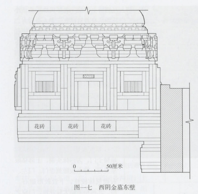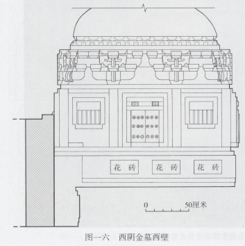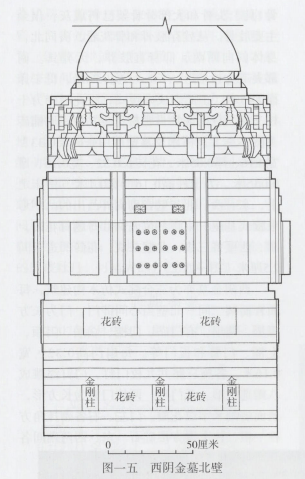 西阴金墓亦为三合院式仿木构建筑,每面皆面阔三间。北壁当心间辟门,门为长方板形,两扇,有门砧、门槛、立颊、门额、上额、门簪和板门等。每扇门高0.32、宽0.16米,各施三路共九枚门钉,门钉浮雕成八瓣莲花形。无门环。两枚门簪为长方形,表面雕刻米字纹花瓣。门左、右各砌抹角方柱一根,柱下置方形础石。东、西两稍间各嵌一竖立的素砖,砖凹进壁间1厘米,下沿与门槛上沿齐,大小和束腰花砖相同(图一五)。