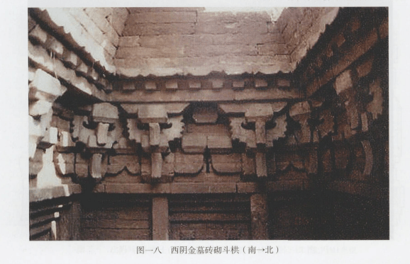 自底向上1.59米处的墓室四壁横砌普柏紡一周,紡上承斗拱十二朵,其中四朵为转角铺作,每面两朵柱头铺作,均为五铺作双下昂,令棋施异形棋,斗颛直面(图一八)。斗拱之上砌標檐樗,樽下有替木,樽上雕方椽,并列勾首滴水。瓦垄上承墓顶,虽然已遭破坏,但仍可看出其为四面起券的洞室结构。