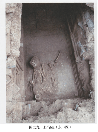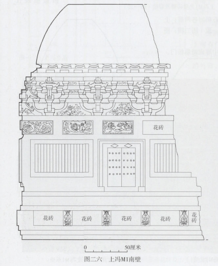 另外,以墓门中线为界,上冯M2的斗拱明显表现出两种不同风格:南半部表面经水磨,庄重规整;北半部简洁率意,与上冯Ml相同。根据砖作的叠压关系并参考葬制,推断此墓先建成南半部分,后在建造Ml时又补建了北半部分,故建造时间上M2早于Ml,二墓下葬时间相同。两墓相距数米,应属于同一家族。