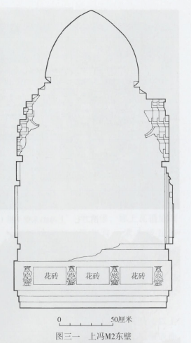 基座高0.6米。除西壁外,其他三壁皆为砖砌凸字形束腰式,束腰部位嵌有与上冯Ml同样题材的力士柱和花砖,北壁有力士柱六根、花砖五块,东壁有力士柱四根、花砖三块(图三一),南壁有花砖四块。南壁花砖凹进壁间1厘米。