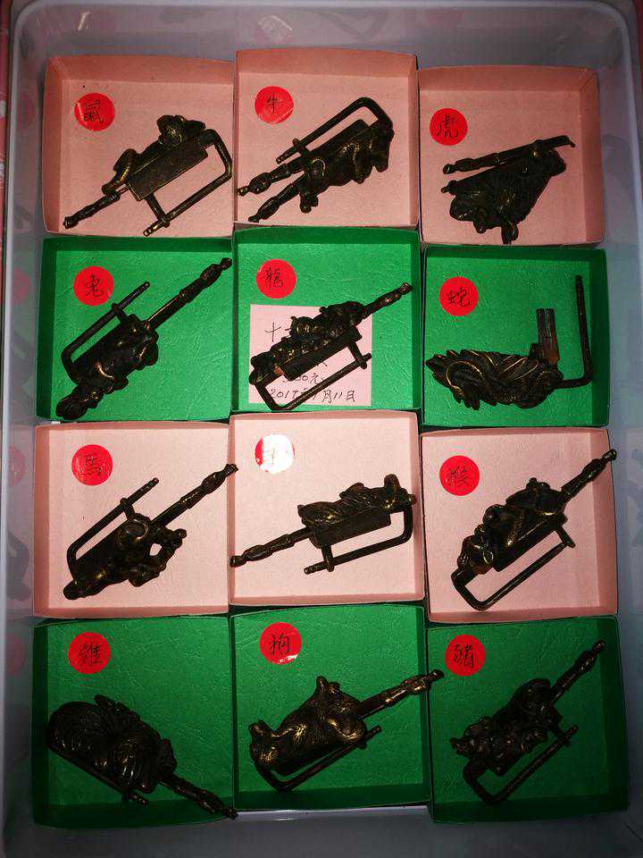 吴老又打开一只红色的铁盒,露出了十多个小动物模样的小型铜锁,每把锁都打造成不同的动物种类,有鸡、牛、羊、蛇、虎、马等,外观都栩栩如生,总共十二种,刚刚好就是中国传统的十二生肖。