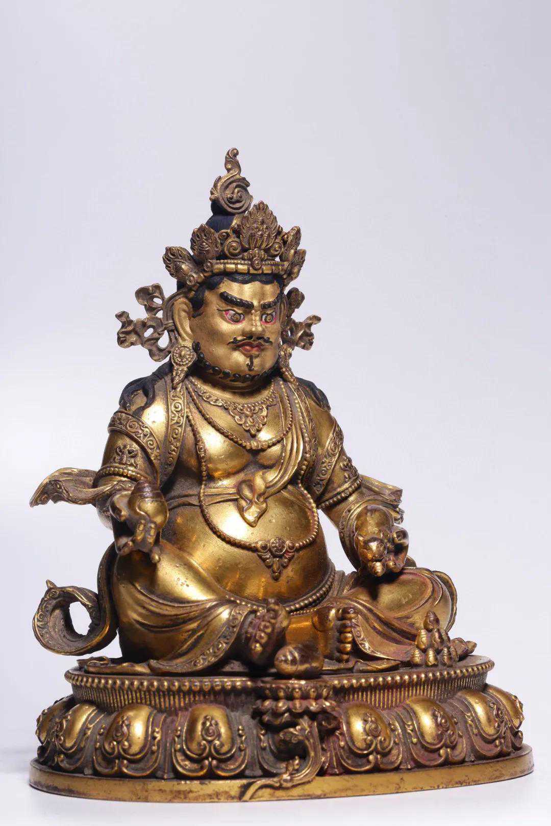财神面相方阔,法相庄严,头戴宝冠,束高髻,戴大耳珰。上身袒胸露腹,披皂带,项饰璎珞,手饰钏镯,一手持摩尼宝珠,一手握吐宝鼠,左腿盘曲,右腿蹬起,舒坐于莲台之上。造像整体鎏金色泽光亮,精美华丽,工艺纯熟,线条流畅,带有浓厚的藏传佛教造像特征,是为精品。