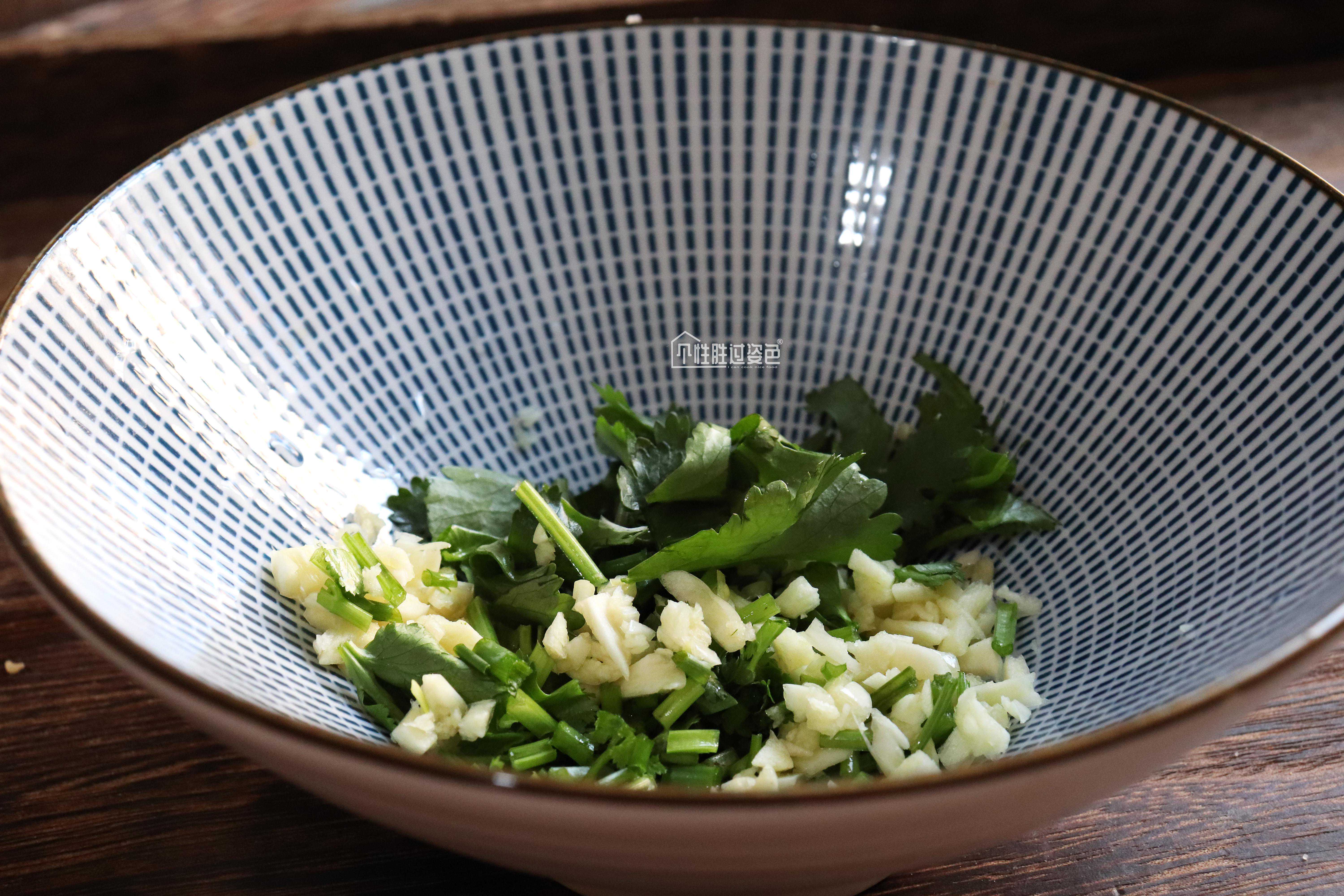 2.碗中放入1勺蒜末、1勺葱花、1勺香菜碎