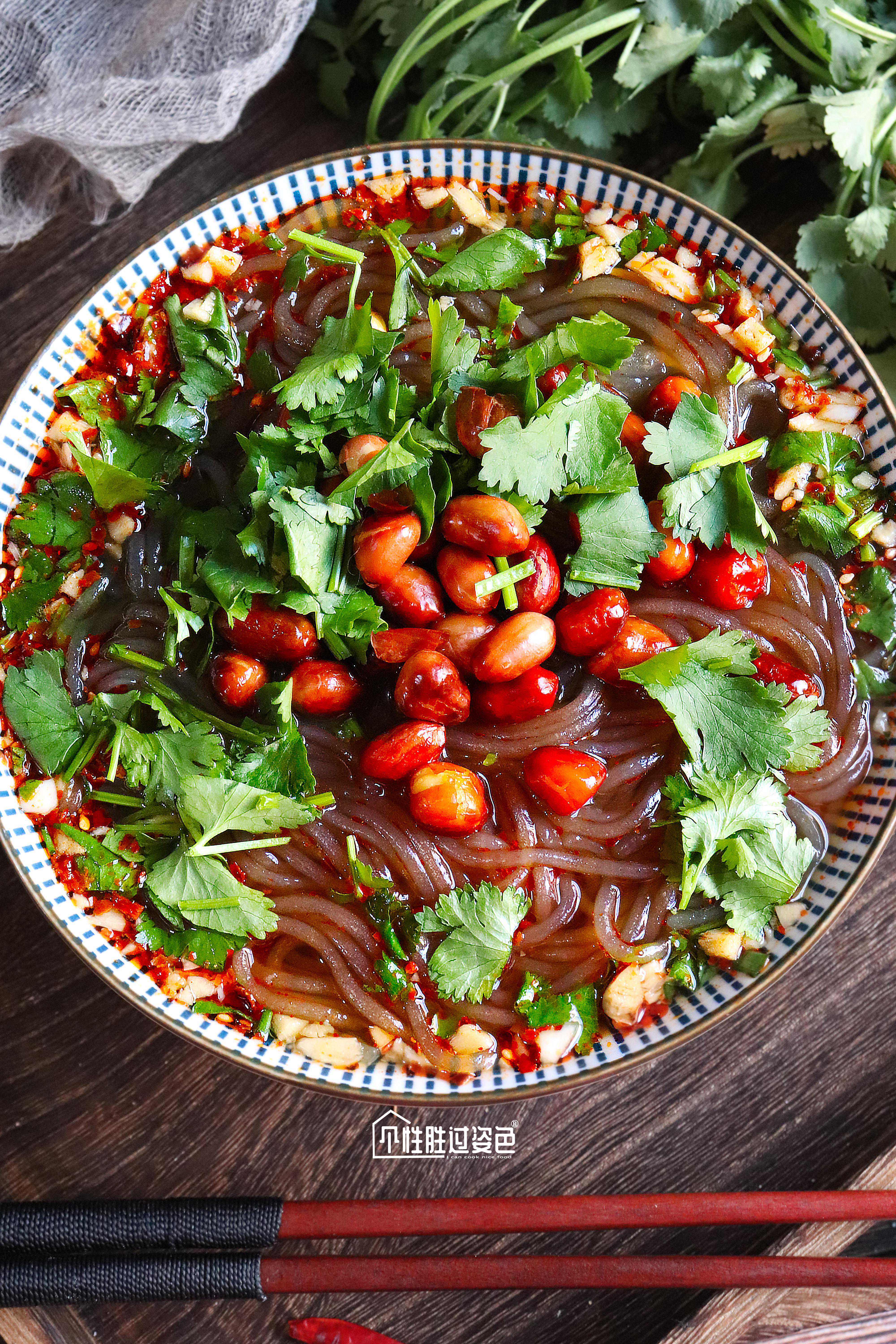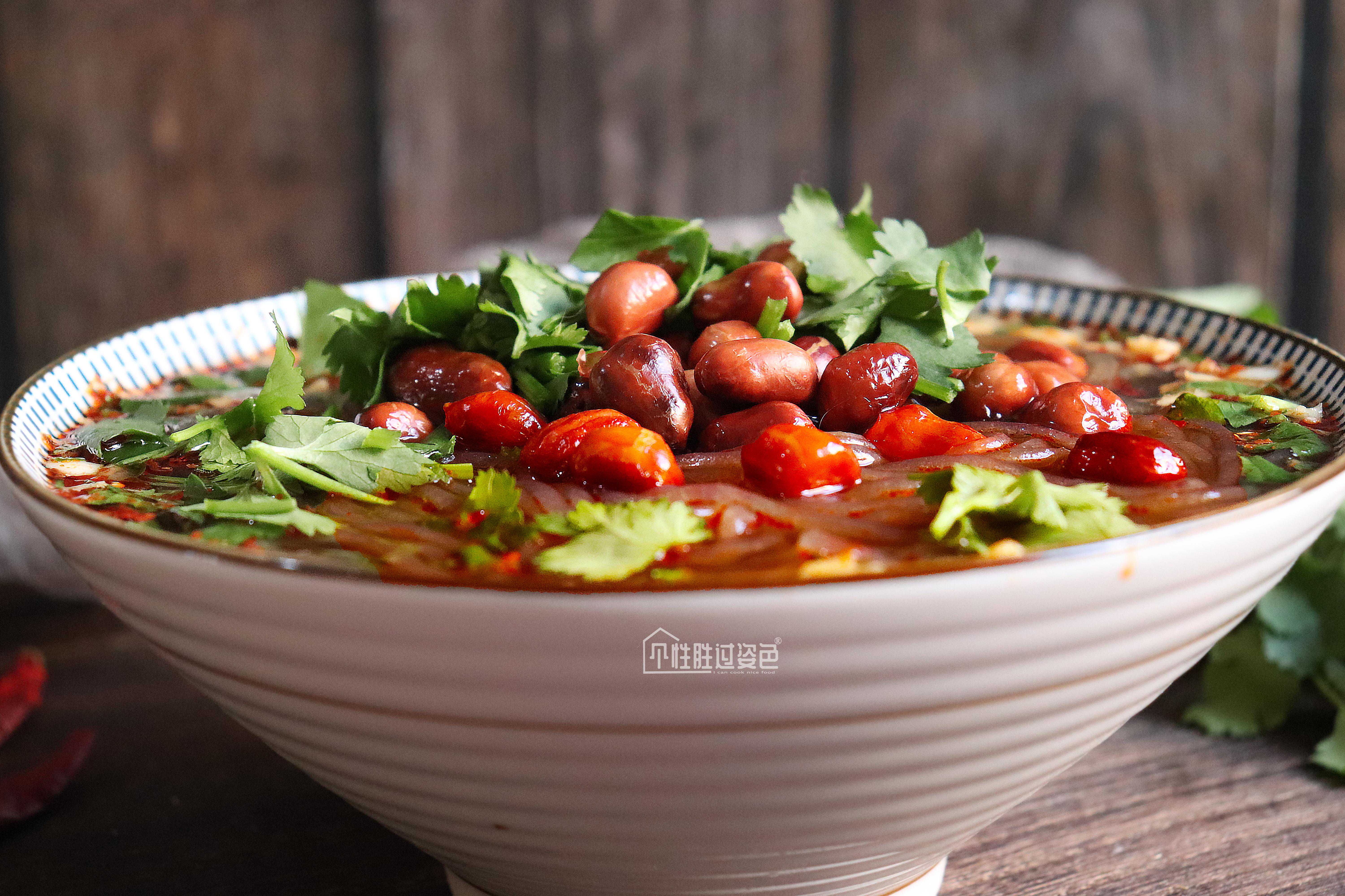 7.将煮好的粉丝放入调好调料的碗中,撒上花生米即可