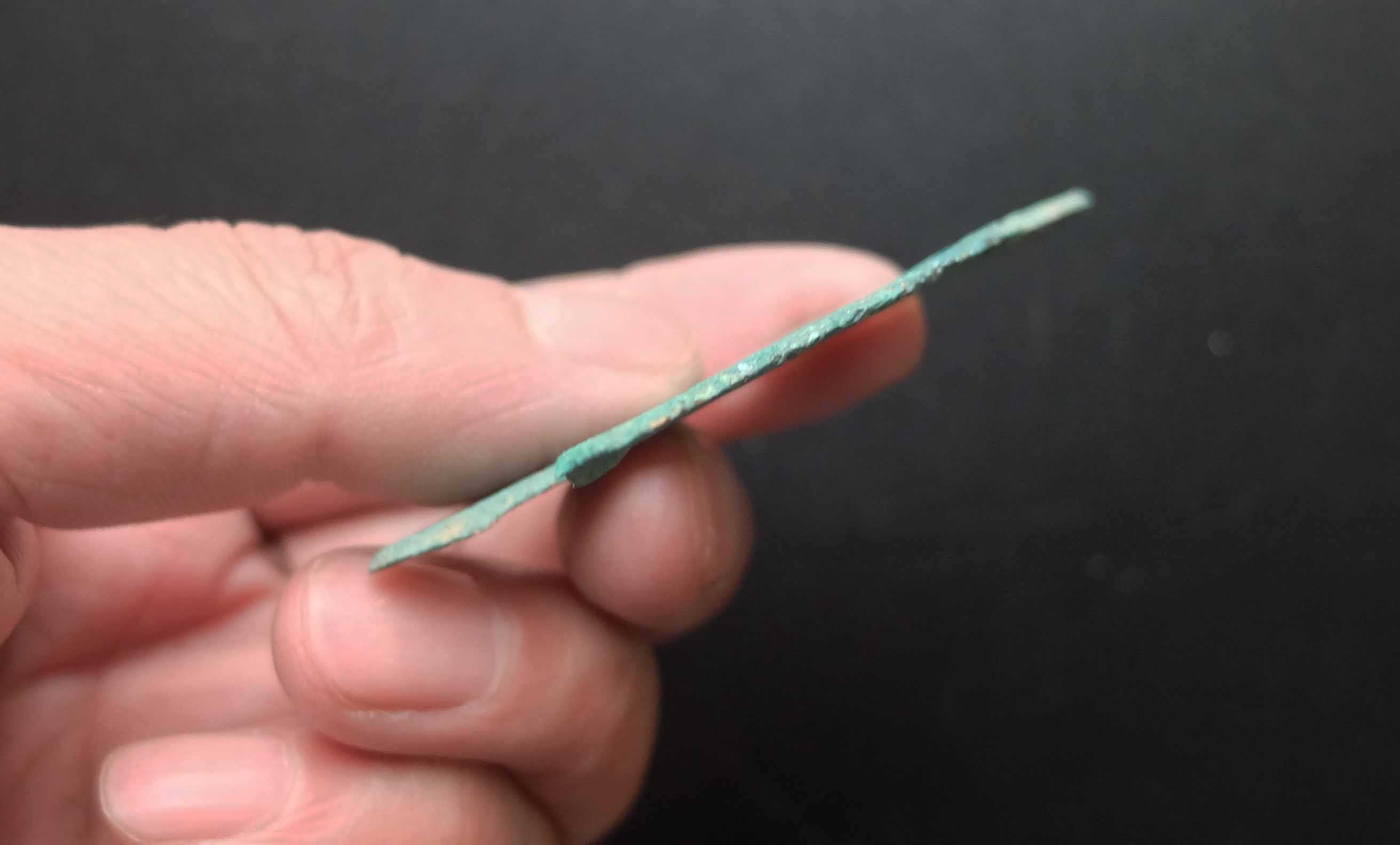 次观铸相。不难看出,本品铸制较为规整,高约72.79毫米,重约10.66克,厚薄适中,形制属于圆足布之大型。续观铸相,圆足首规矩,地章(肉)平整,廓线清晰,文字线条鼓凸自然有度。其边缘尚有少量铸制流铜毛边,整体左右对称,亦是凸显自然铸相。无需赘述,本品乃为其时官炉所铸,铸相开门。