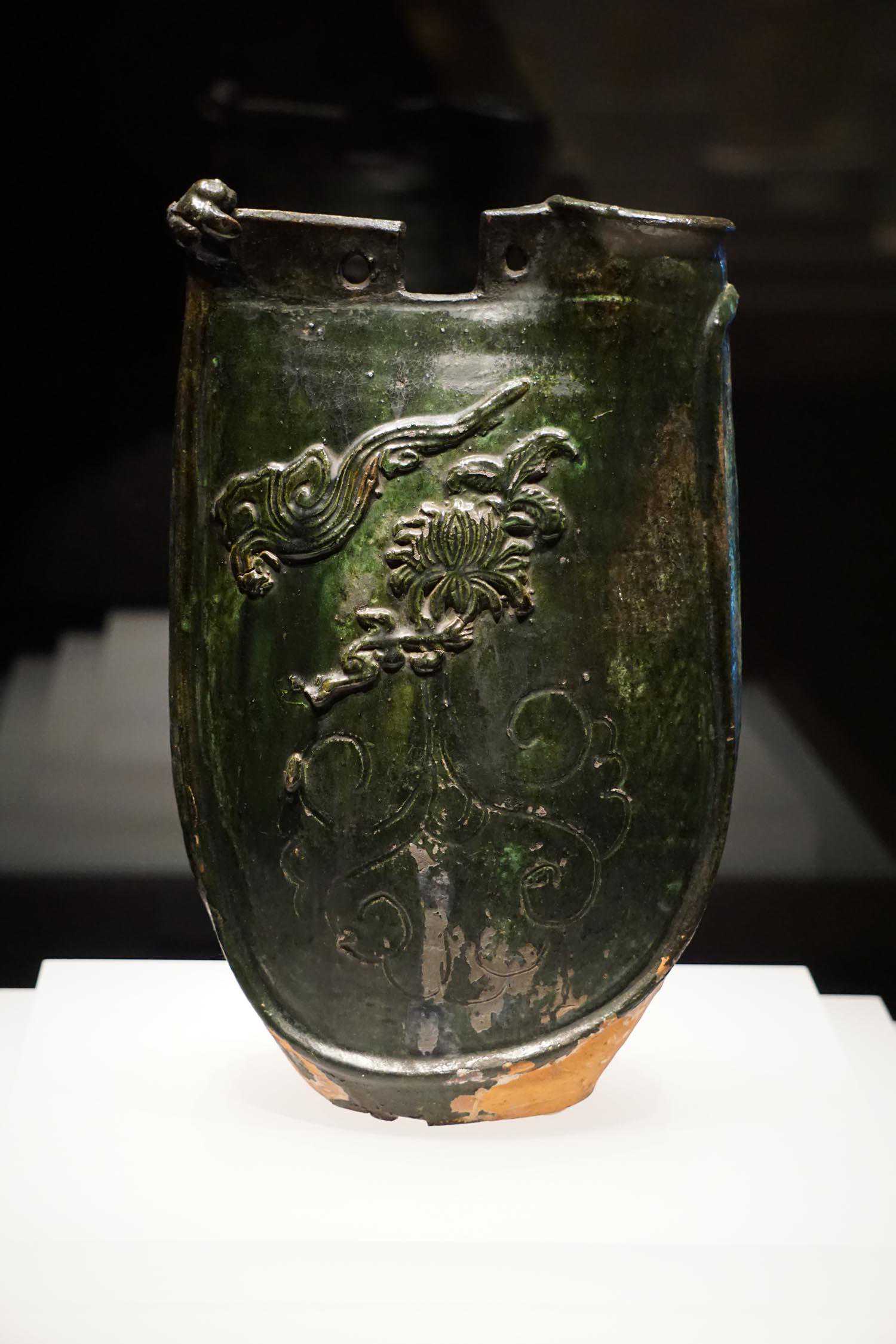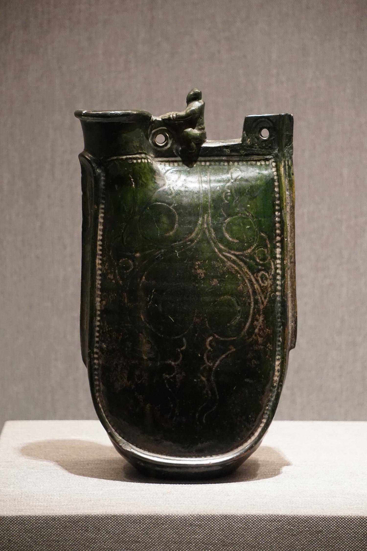 绿釉贴盘龙菊花流云纹双孔鸡冠壶辽