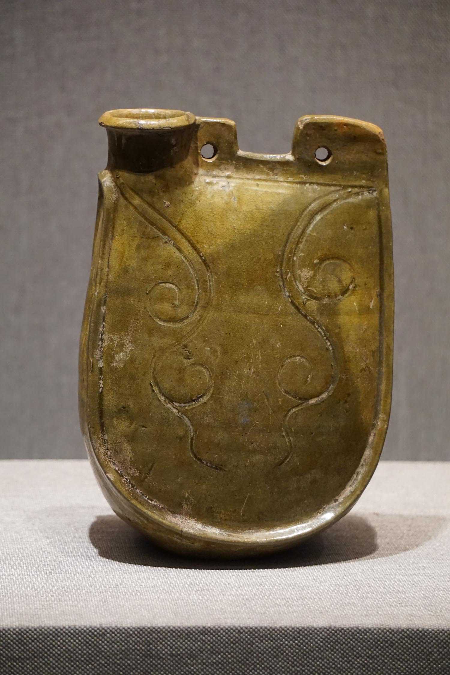 鳝鱼黄釉雕几何纹穿带扁壶辽