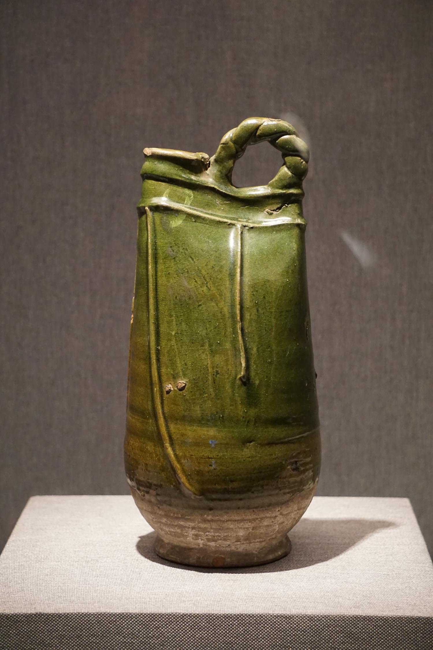 绿釉贴皮条装饰绳梁鸡冠壶