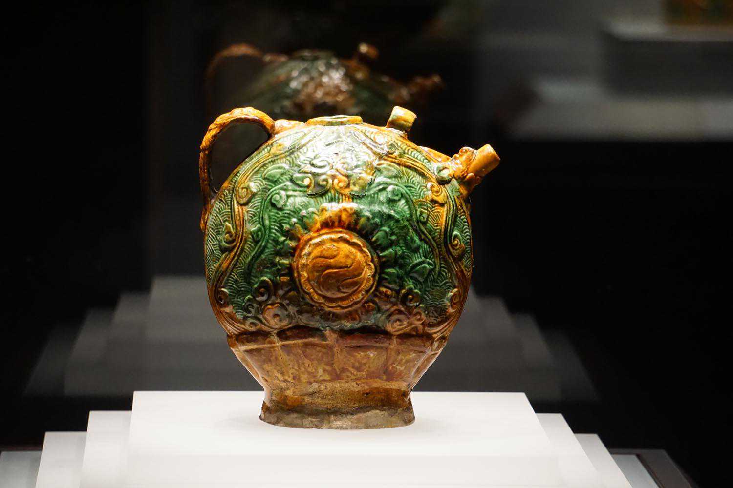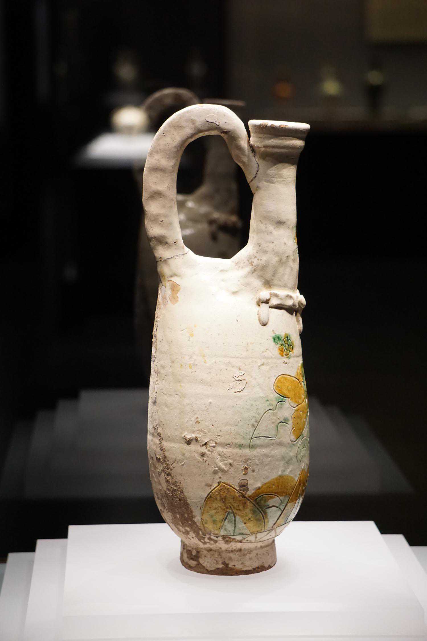 三彩釉印海水流云纹扁把壶辽