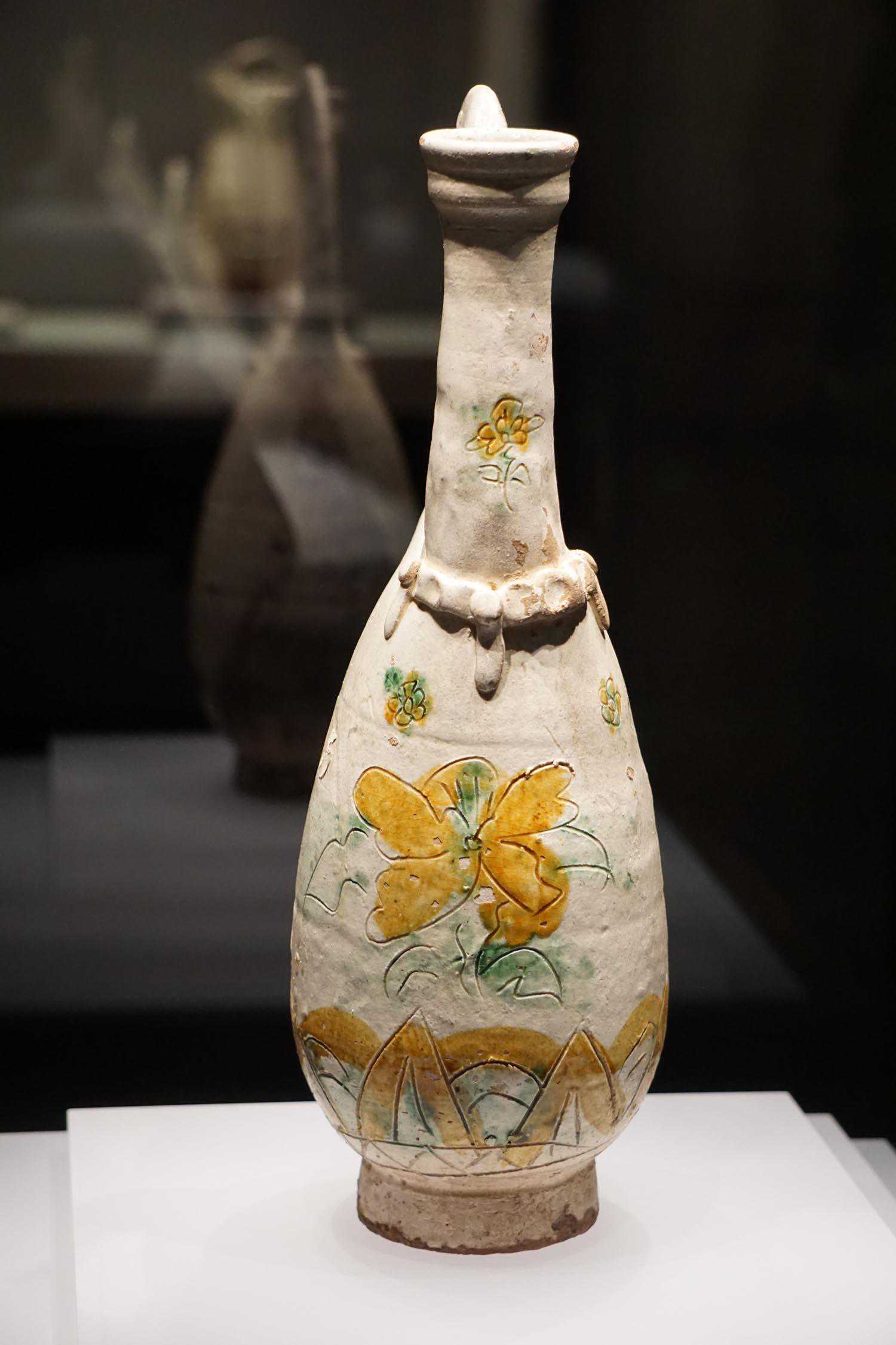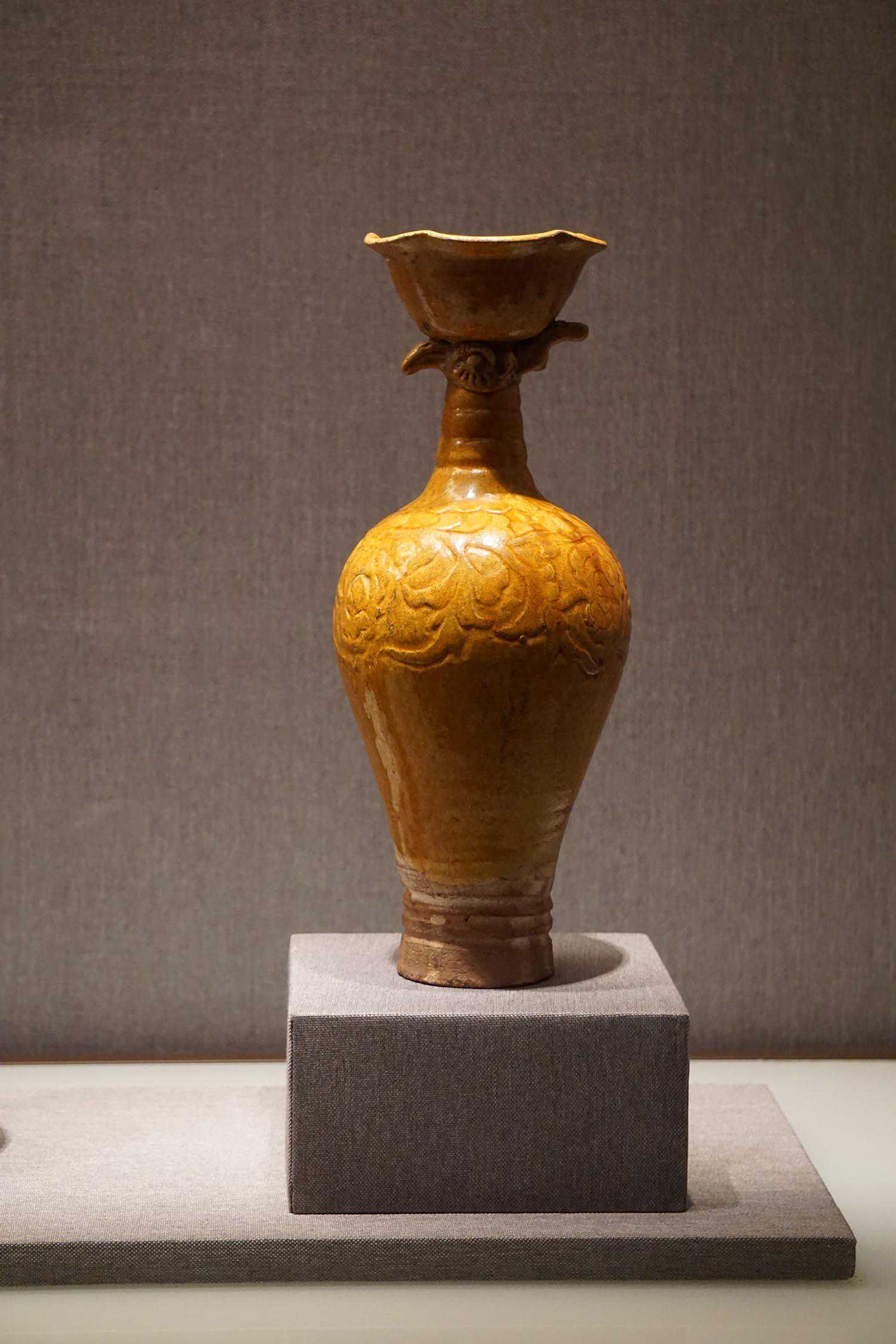 黄釉雕牡丹纹凤首瓶辽
