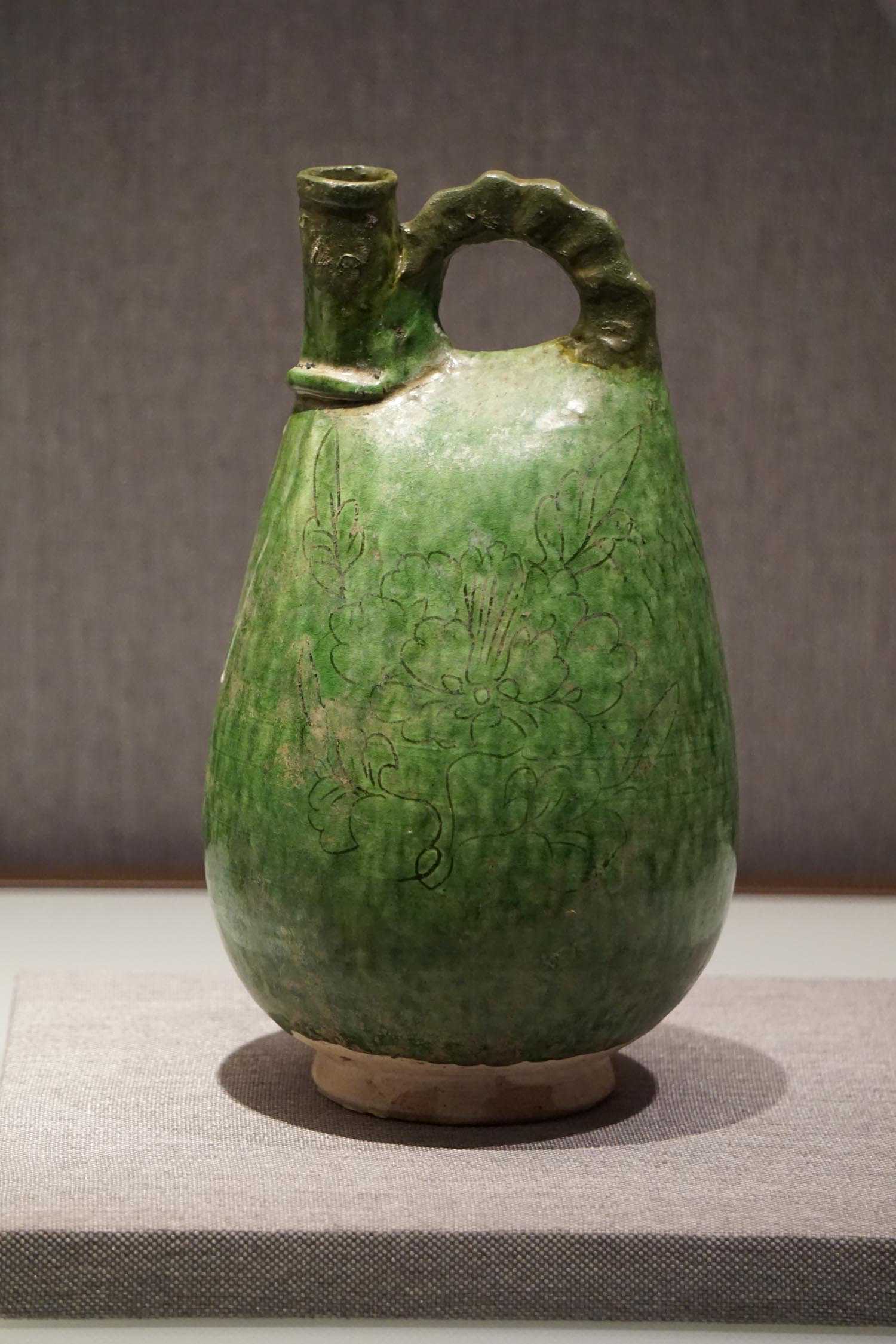 绿釉划牡丹纹单孔鸡冠壶辽