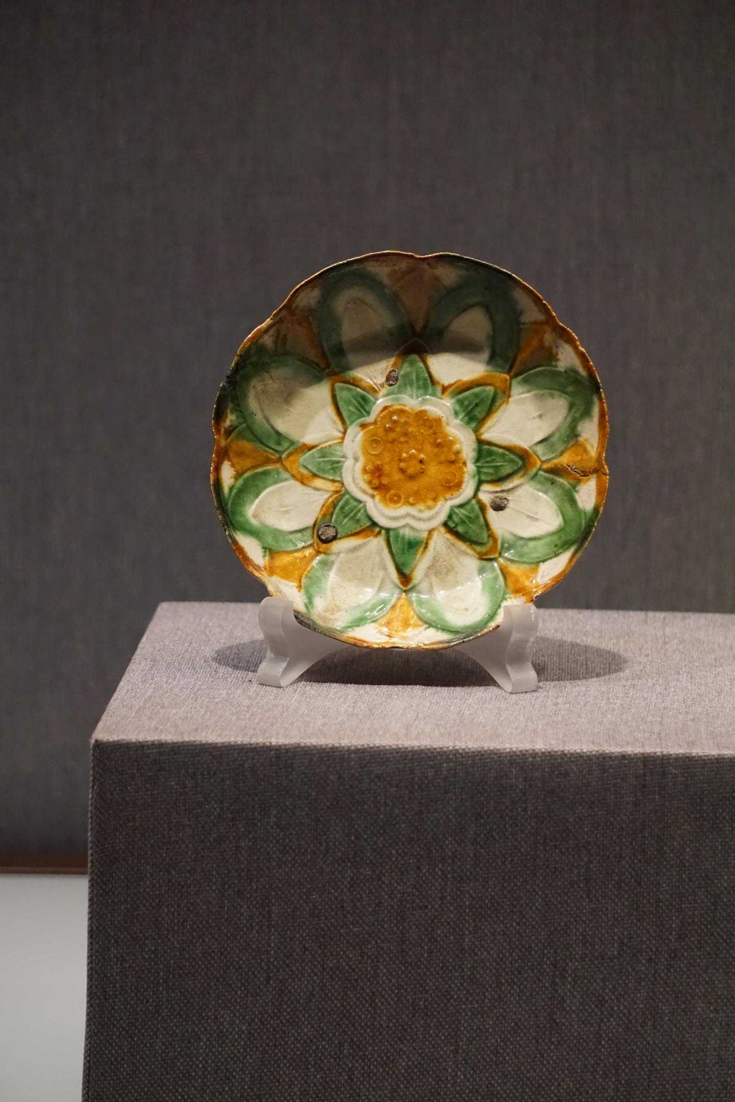 三彩釉印复瓣莲纹花式碟辽
