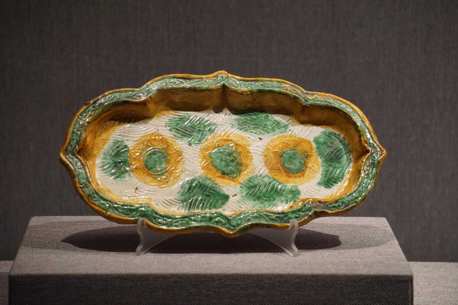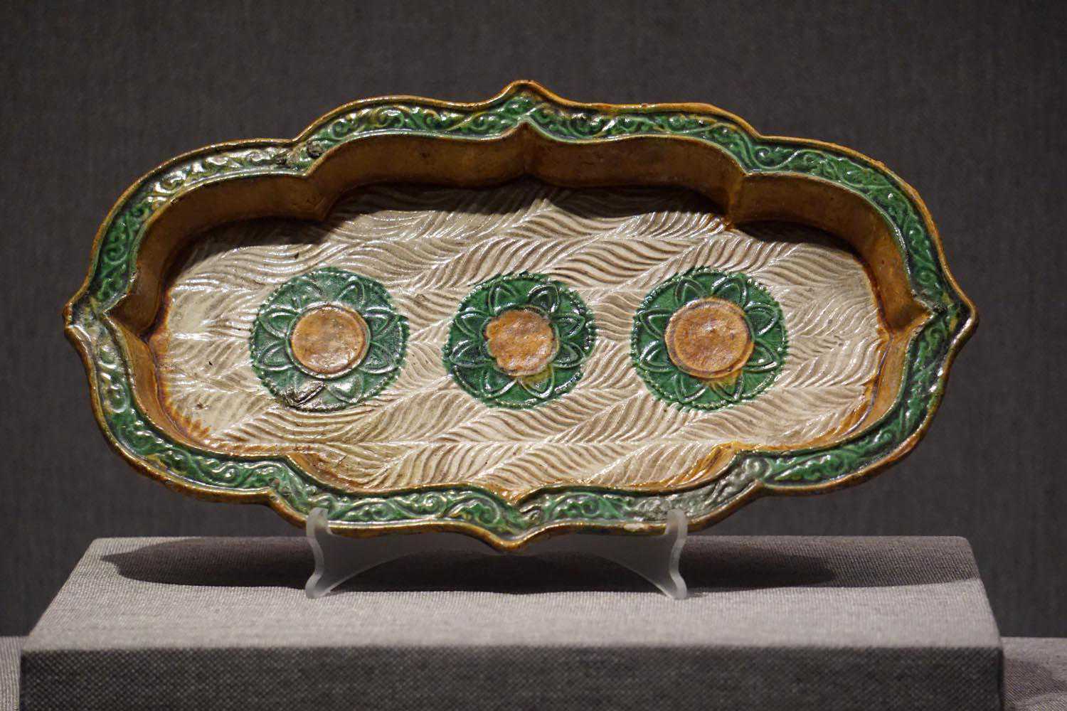 三彩釉印水波三花纹海棠盘辽