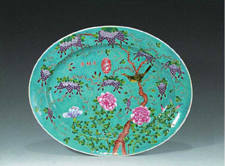 “大雅斋”松石绿地粉彩藤萝花鸟图椭圆盘
