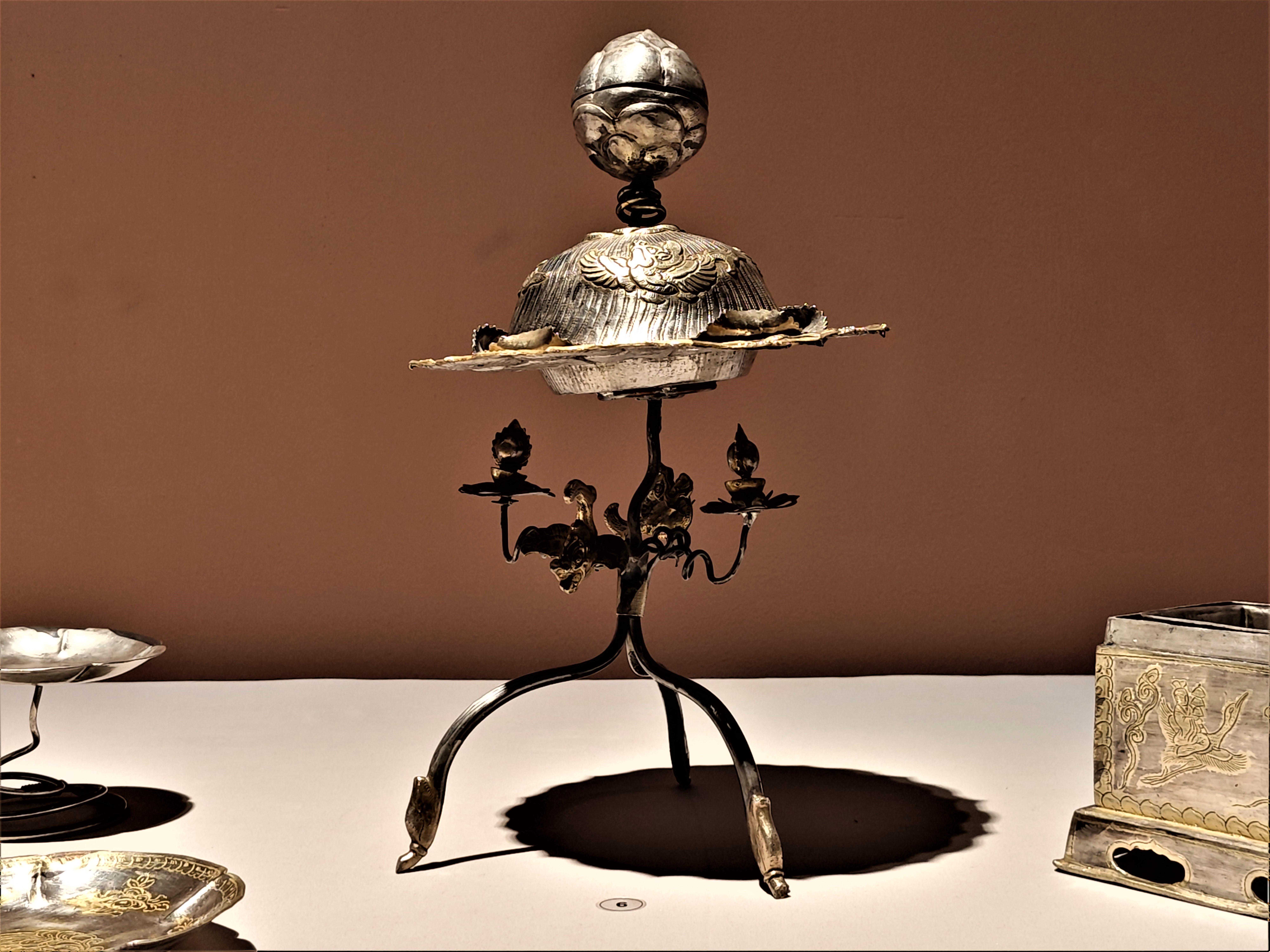 宜兴窑紫砂凸花纹诗文盖罐(左上)、银提梁方火壶(右上)、雍正款斗彩团菊纹盖罐(左下)、金爵(右下)