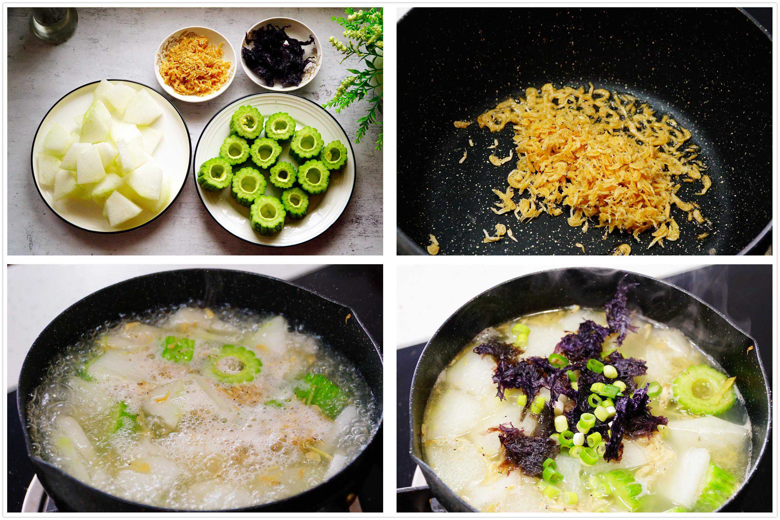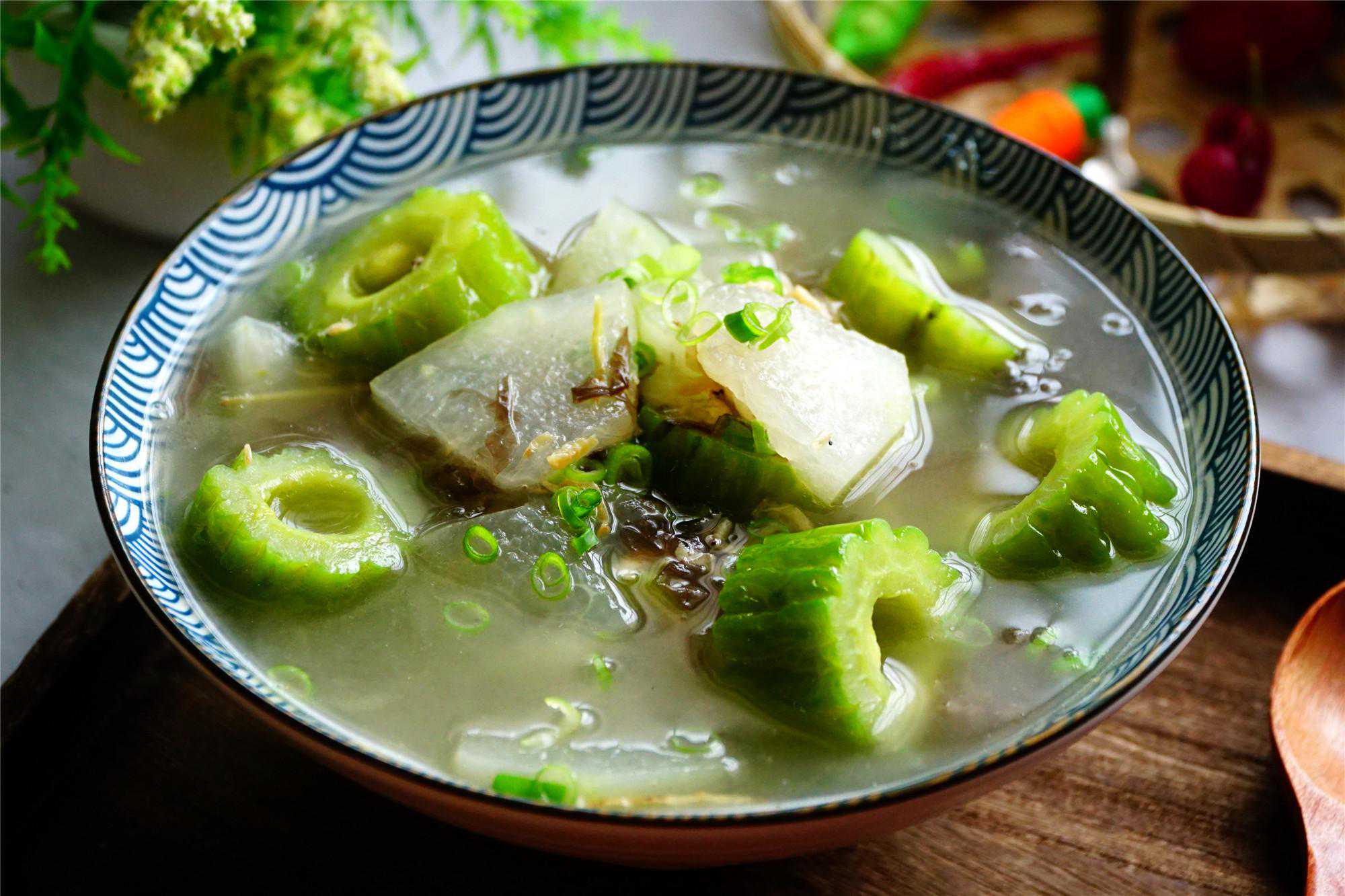 二、苦瓜虾皮汤苦瓜虽味道苦,不大招人喜欢,但好在有着清热下火,降暑止渴的功效,是夏天不可错过的时令蔬菜,将苦瓜煲汤味道极好,再加入少许虾皮,紫菜来辅助,保留食材中的营养物质,做出来的汤鲜美无比,味道比排骨汤都要鲜,隔三差五喝一碗,感觉神清气爽,皮肤都更滑嫩了。