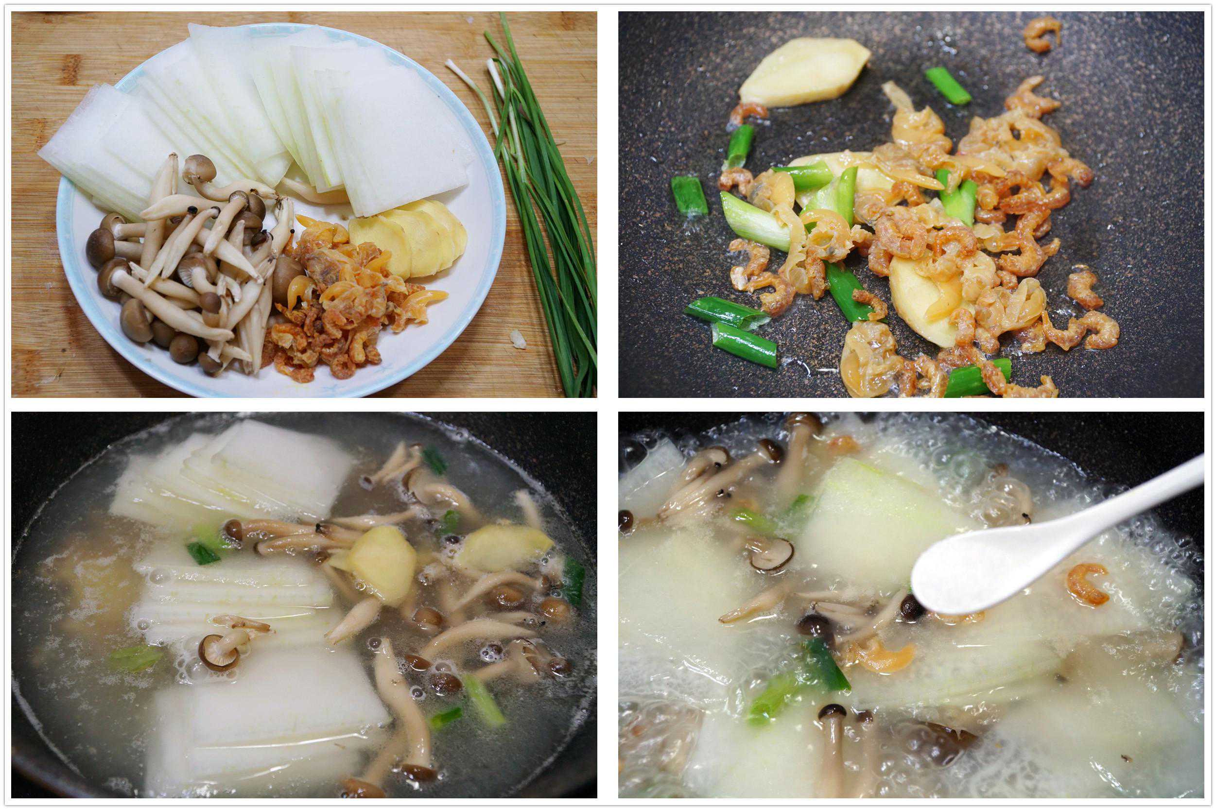 所需食材:干蛤蜊肉,干虾仁,生姜,蟹味菇,冬瓜。