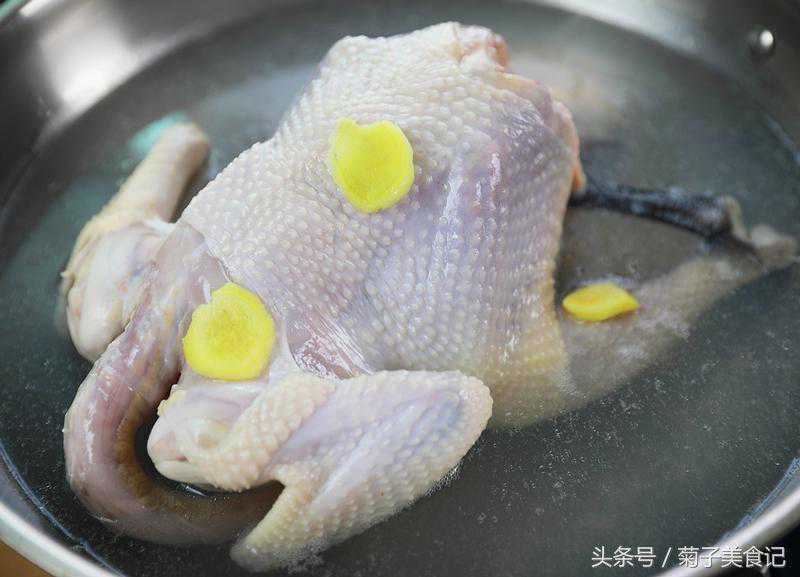 ▼3、把整只鸡洗净,锅里放几片生姜片冷水下锅先焯水,中火,这样有取到去油去腥的效果,要煮透,后面炖出来的汤才会清澈明亮
