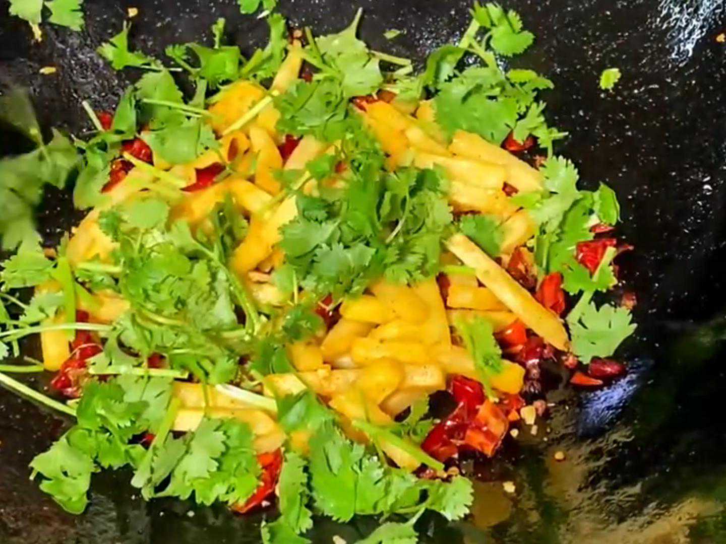 6.出锅前加入香菜段,再次翻拌均匀,快速装盘即可。