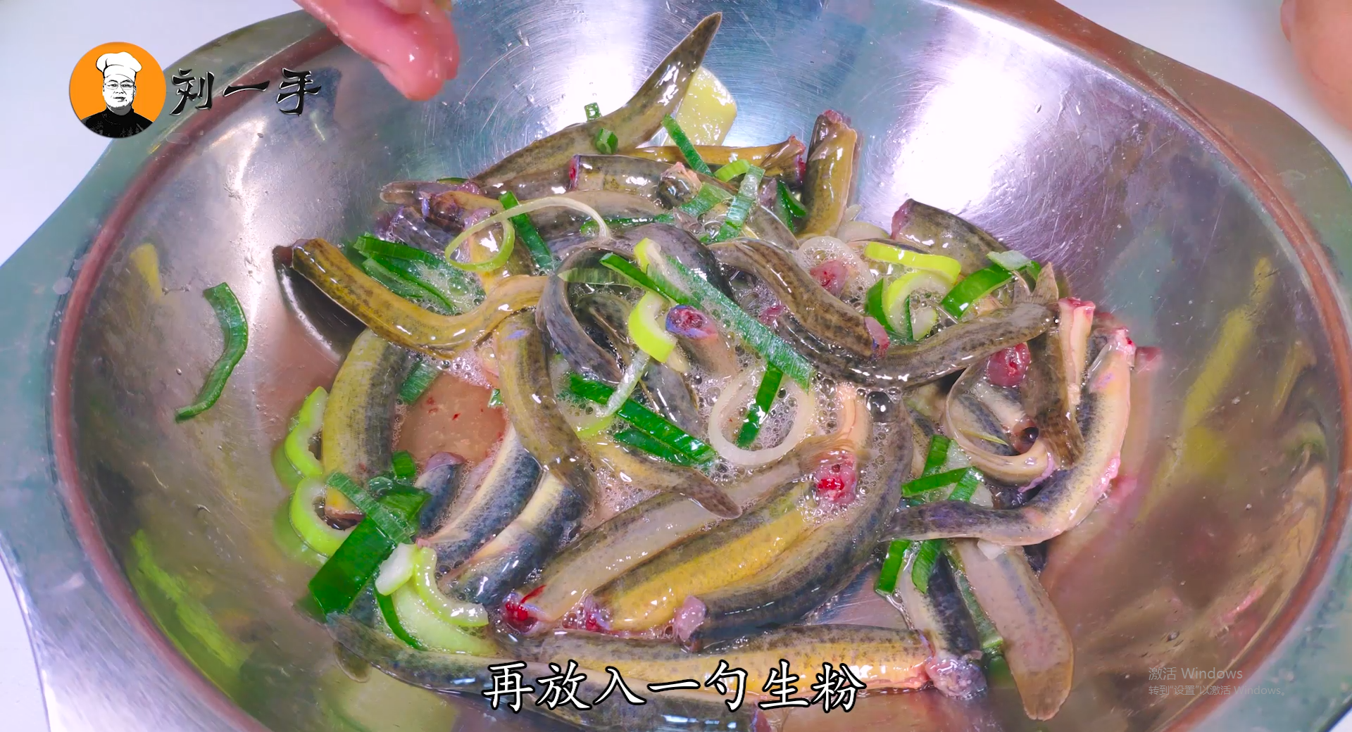 5、然后把处理干净的泥鳅腌制下,先放入一勺食盐、少许料酒、姜片、大葱末上手揉抓均匀,再放入一勺生粉再次抓匀放入生粉可以使炸好的泥鳅更酥脆。再把一个鸡蛋打入碗中,再加入少许凉水,搅匀备用