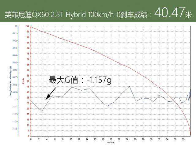 刹车测试时,QX60并没有因为舒适的悬挂而出现明显的前倾现象,姿态相当稳健,在刹车初段的最大G值超过了-1.1g。