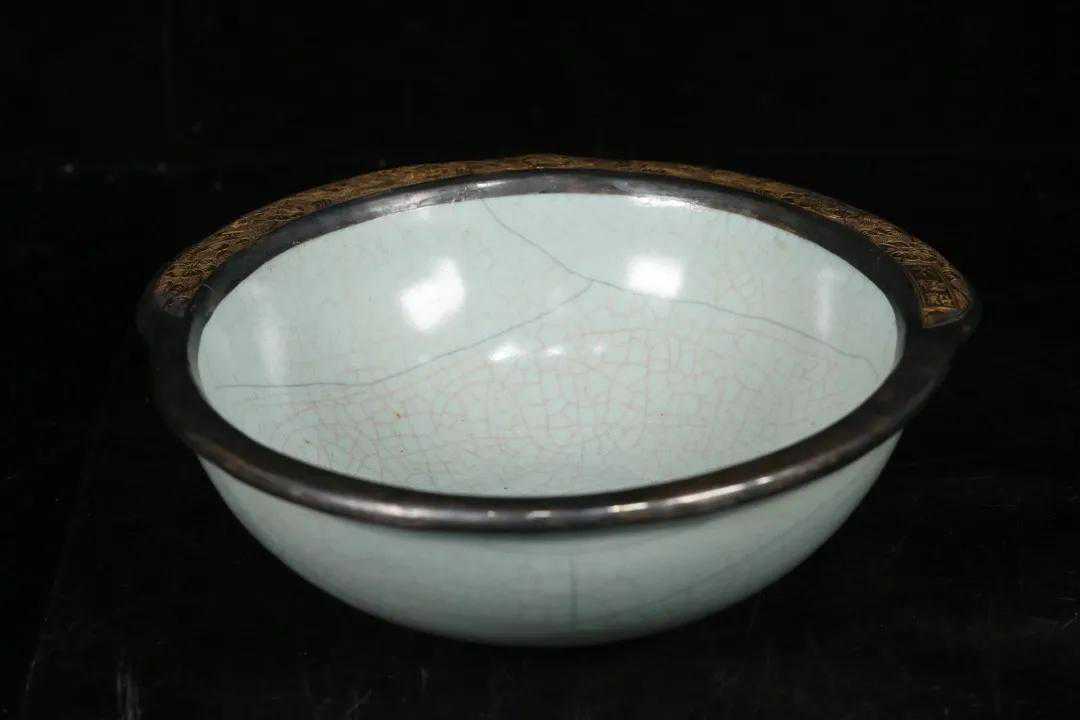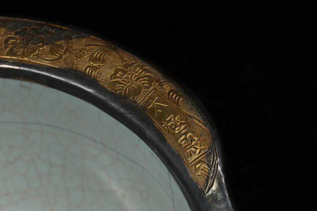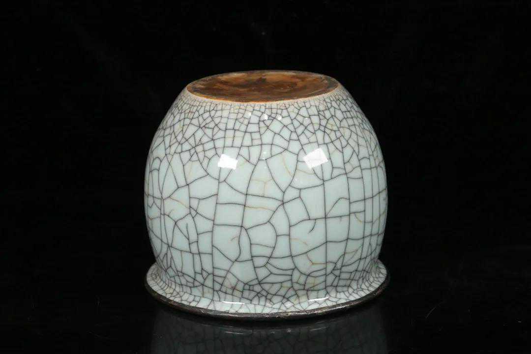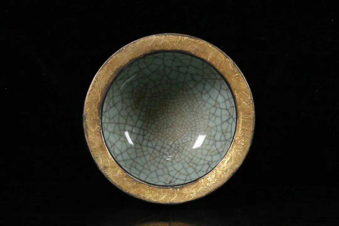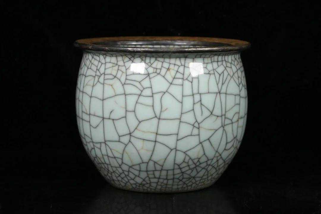 旧藏,哥窑缸,器型规整大气,施釉均匀,釉面莹润漂亮,满开片,口沿包银鎏金施缠枝花鸟纹,落款“宁寿宫”品相好,尺寸:高18.8*口径22.7cm。