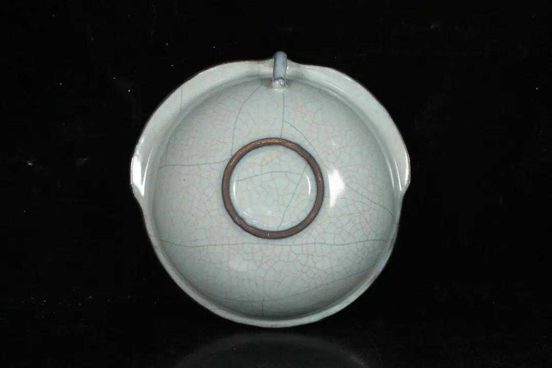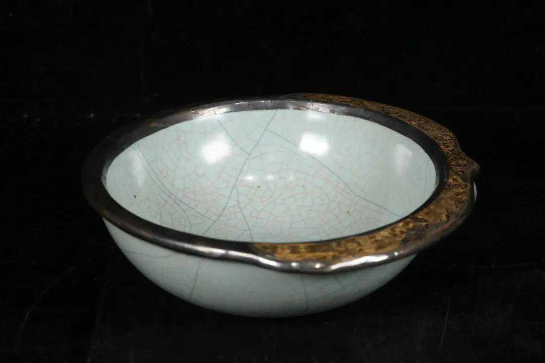 宋代,哥窑寿桃碗,器型周正美观,寿桃形状,带一小耳,整体施釉,釉层坚硬,釉面肥厚莹润,包银鎏金施缠枝花鸟纹,落款“太极殿”,品相完好。尺寸:高7.3*22*22.8厘米