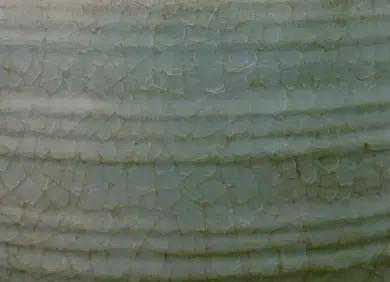 “鱼鳞”状开片:这是一种十分独特的开片现象,主要集中在北宋汝窑、宋官窑和少数南宋龙泉窑制品上,其他品种未曾见过。形态是在肥厚釉层的层与层之间产生的层间开片现象。这类瓷器釉层很厚,有些甚至超过了胎体厚度。如此厚的釉层是多次上釉形成的,每次上釉都要等干燥后再施,故各层釉之间薄厚不均,瓷器烧成后,层间应力不同,在层间产生断裂。