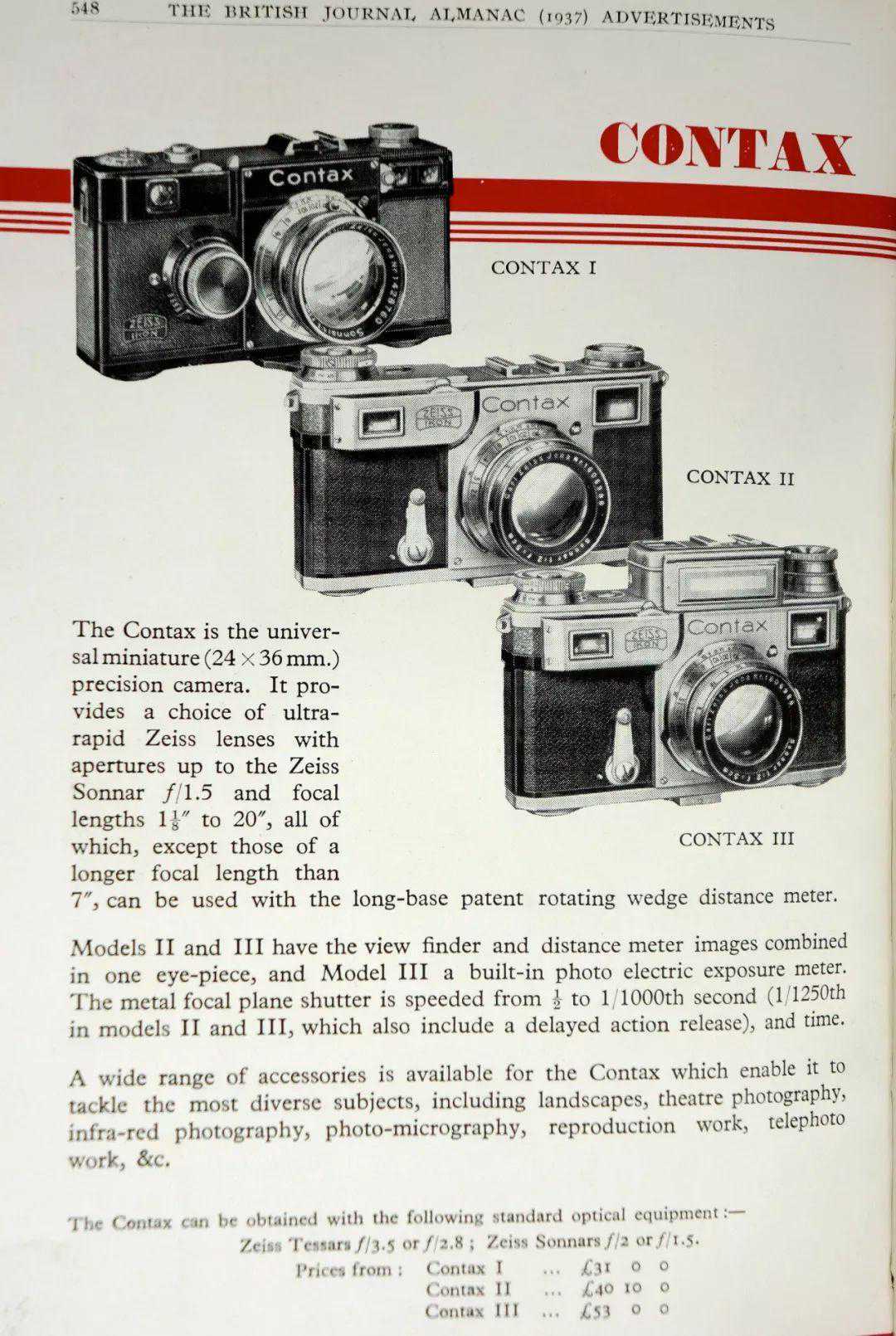 10.1937年出版的英国摄影年鉴上刊登的Contax三种型号相机的广告