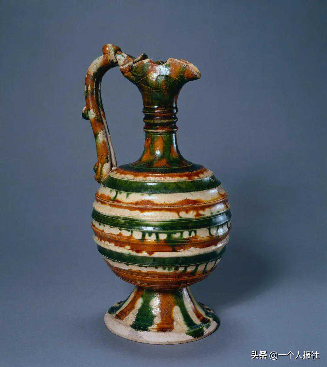 口呈鸟形,柄为鸟羽环,造型源自西亚和中亚地区的金属制品。唐代陶艺家自由地采用异质造型(鸟首壶)和异质图案(花冠、藤蔓、棕榈和圆形连珠纹等),这些艺术表达体现了那个时代的自信和精神。