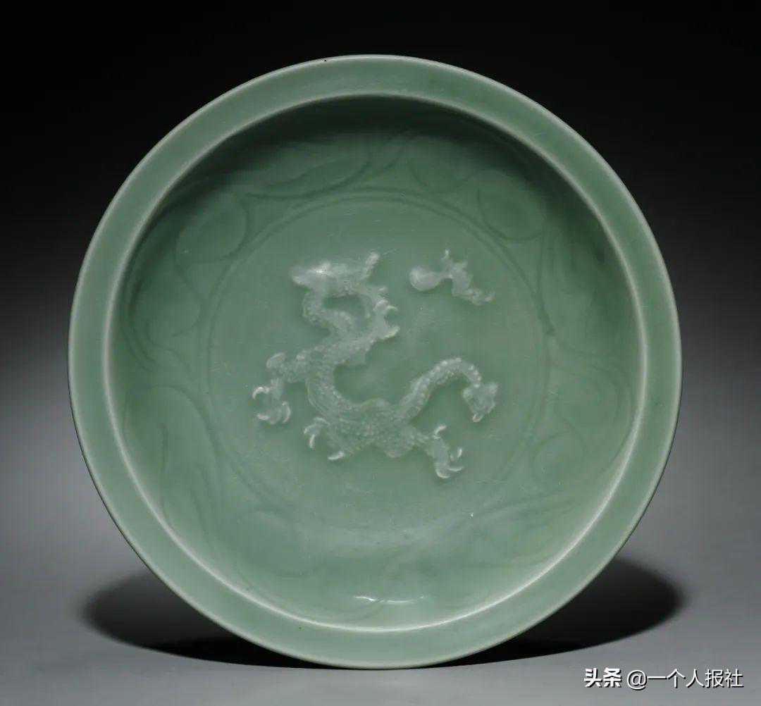 元龙泉窑青釉贴塑龙纹盘