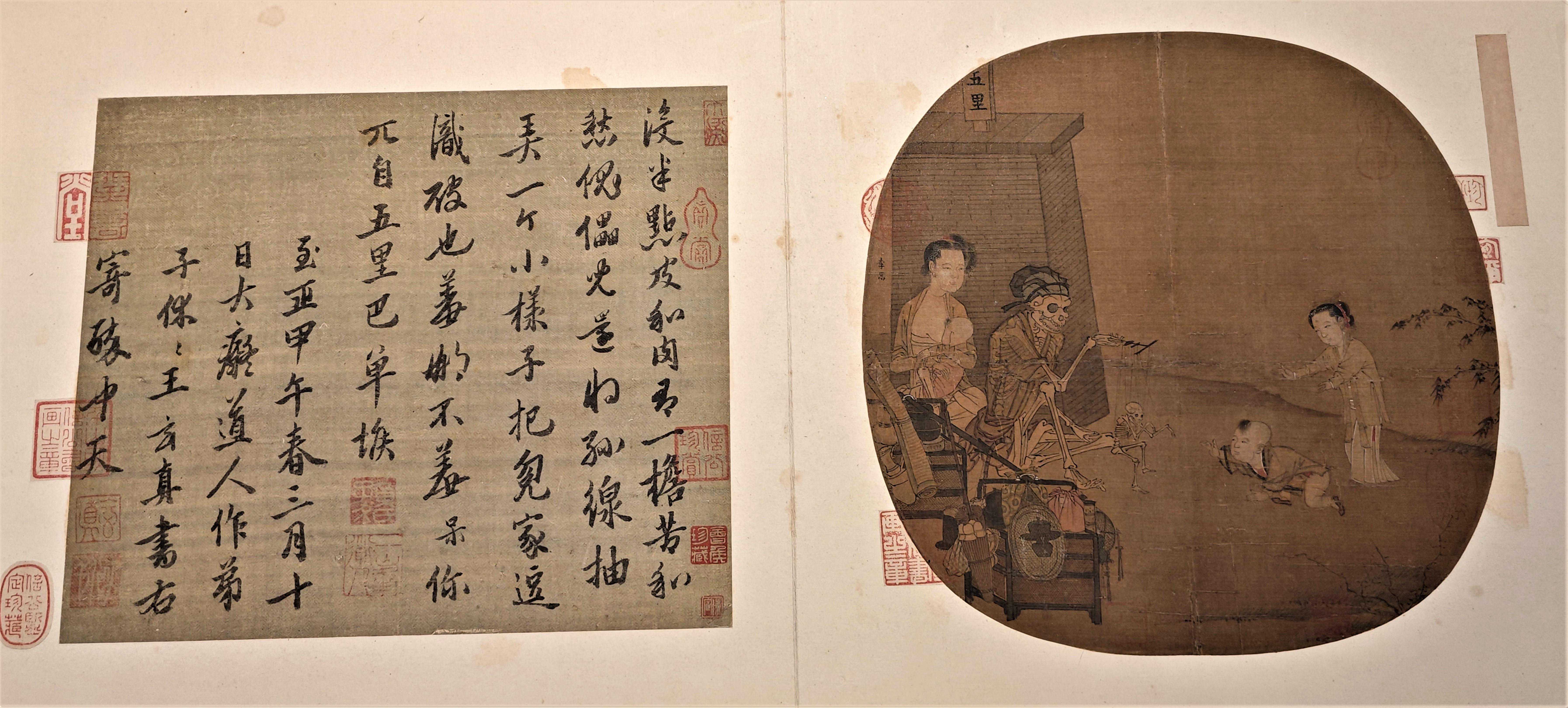 在这幅南宋画家李嵩绘的名作《骷髅幻戏图》中,傀儡艺人的担子上就有一件点茶用的曲柄茶瓶。图中的悬丝傀儡戏是宋代木偶戏的一种。只见一个附着文人衣冠的大骷髅坐于画面左边,左手骨按于左大腿骨接近膝盖处,右手提线控制着小骷髅。小骷髅对面一小儿昂首伸出右臂,正欲伸手触碰。南宋时期朝无明主,官员腐朽,王朝风雨飘摇,命悬一线。千百年来无数学者从中解读出当时的社会状态,茶文化自然也隐于其中。