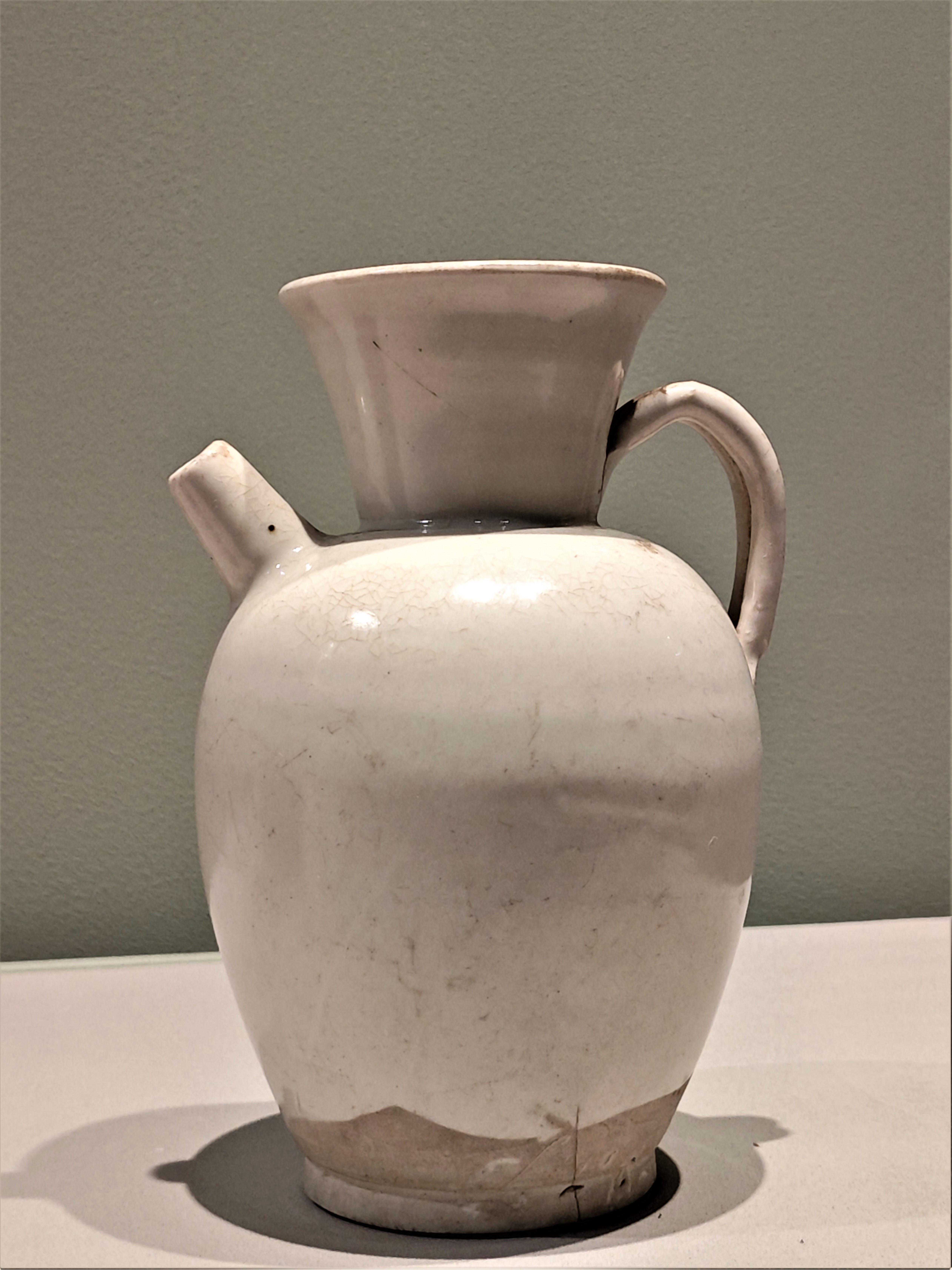这套2022年出土于山西长治屈家庄村唐墓的白釉茶具组合。囊括了茶碾、茶炉与茶釜(该器物的茶釜与风炉连为一体)及茶盏托,器物十分精美,组合完整,是唐代茶室的最新考古成果之一。反映了基础的煎茶法:先用茶碾碾茶饼(左一),风炉内放置炭火,茶釜中依次放入适量的水、盐、茶粉(左二),最后将茶汤添入茶碗以盏托饮茶。
