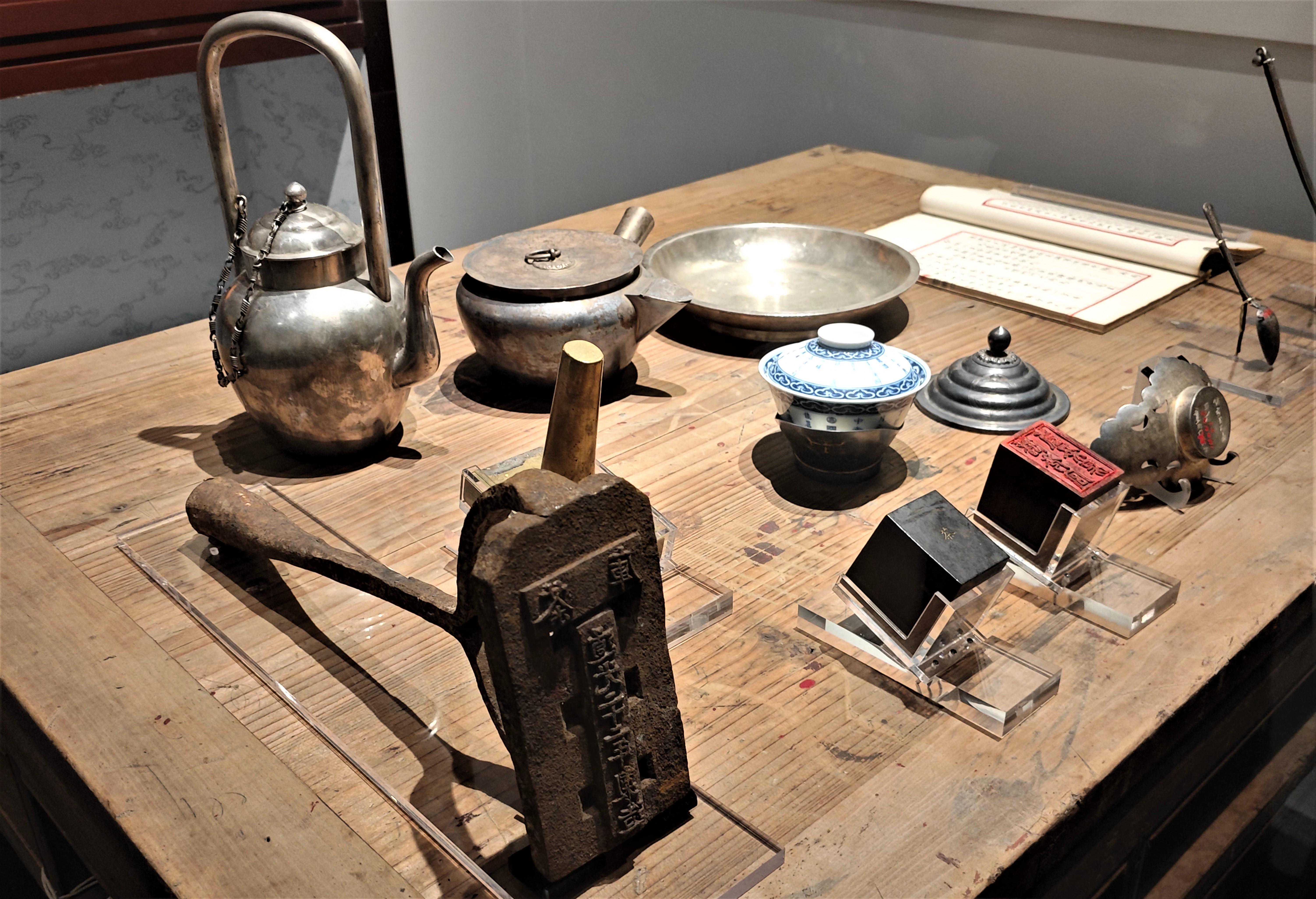 宜兴窑紫砂凸花纹诗文盖罐(左上)、银提梁方火壶(右上)、雍正款斗彩团菊纹盖罐(左下)、金爵(右下)