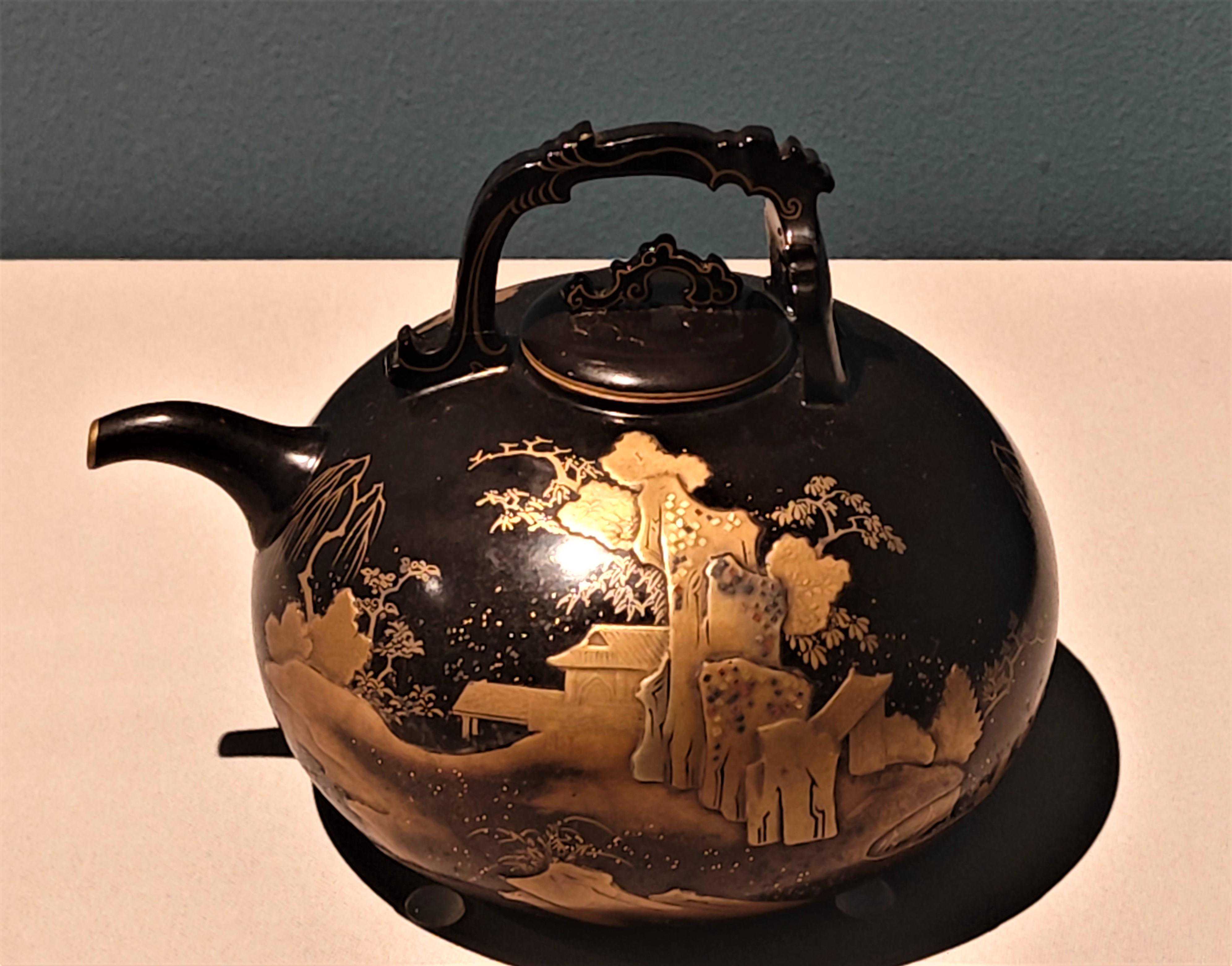 展览中还有来自英国、日本、俄罗斯的茶器精品,还有清代宫廷中使用和收藏的来自异域的茶器,以及由清宫造办处制作的外国风格的茶器。比如:故宫博物院收藏的日本银鸢尾花纹茶具套装、法国蓝釉描金寿字纹茶具、俄罗斯银刻花双耳六足盘,以及维多利亚与艾伯特博物馆收藏的“中国风”茶具、英国沃克斯豪尔瓷厂烧造的软瓷印花青花庭院图茶叶罐、德国麦森瓷厂烧造的红陶模印花卉纹壶、珐琅彩描金人物图杯及杯托等。