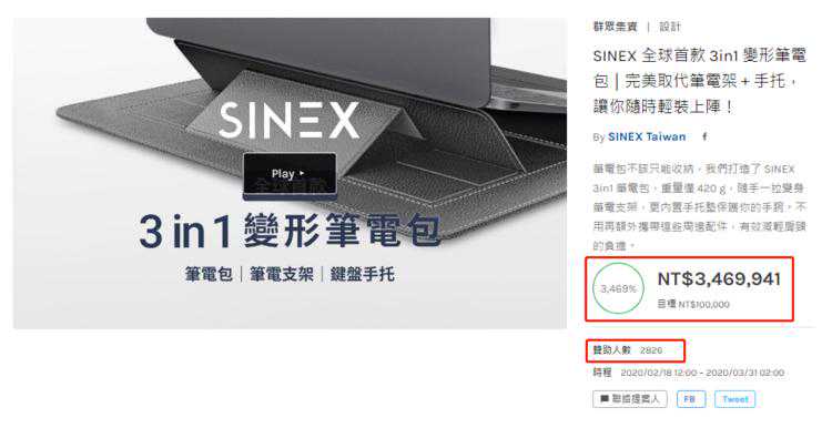 SINEX三合一电脑支架包曾经在海外众筹网站Kickstarter上凑得346万新台币,完成率高达3469%,受欢迎程度可见一斑。