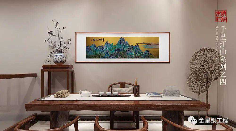 铜往往在人们的常规印象中都只是单一的色调。而大师运用冷彩铜技法,赋予铜新生命一般,用鲜亮的温柔包裹着铜,向世人展示”新一代“的画卷。这不单单是千里江山的又一次盛宴,也是铜的第二次绽放。相信每一位路过此画前,都会在感叹古人的智慧画卷的同时,也会对铜器可以有这样独一份的风采而驻足叹赏!