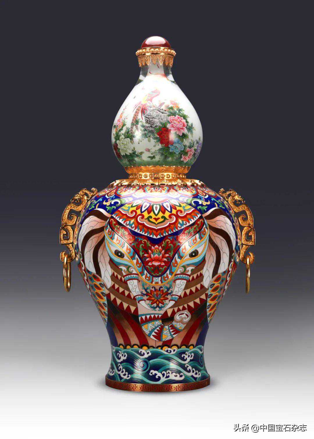 该作品集合了内画、景泰蓝、花丝、玛瑙镶嵌、錾刻、铸造技艺,工艺繁复又精湛细腻,观之明艳高贵、气势磅礴。据悉,该作品在第54届全国工艺品交易会上荣获2019年“金凤凰”创新产品设计大奖赛金奖,并被国际中国鼻烟壶学会特别收藏。
