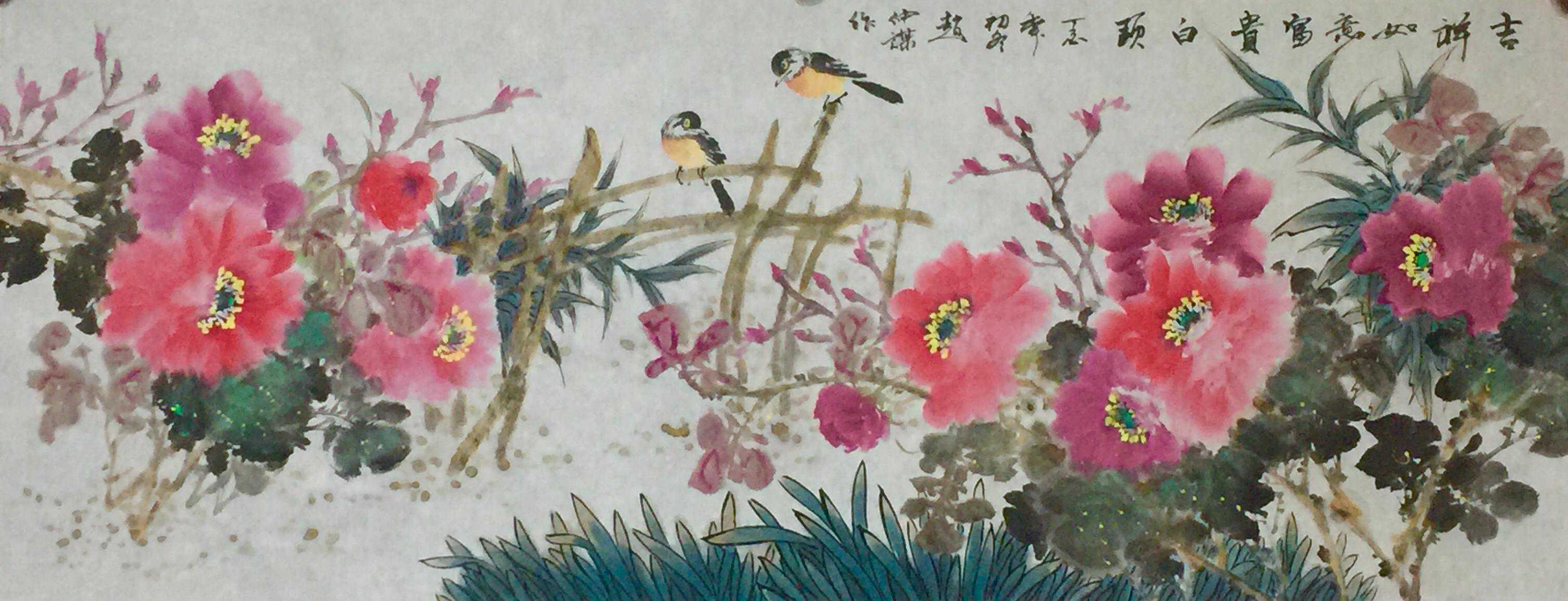 赵仲谋在写好书法艺术的同时,经过西安美院、清华大学美术学院高研班的进修,对花鸟画尤其山水画有了飞跃的进步,在他的画室看到了许多巨幅花鸟、山水创作作品。因在长期的探索与写生和进修的理论指导下,逐渐找到了一种属于自己的绘画语言,这种语言是新颖的,是建立在大写意与工笔花鸟上寓于表现力的,是通过艺术的整合提炼而成的。他将典雅与自然、飘逸与沉稳、简洁与繁杂、严谨与率意十分巧妙地融合于一体,在意与象、形与神、色与墨、收与放、紧与松等意境之间化增与减的调试,以求达到最佳的画面效果。所以,赵仲谋的作品具有双重审美特征,既有西方绘画重视光、影、色的一面,又有东方绘画突出意、情、神、趣的一面。或者说作品的形式更趋近于西方,但其神韵则是东方式的。赵仲谋花鸟画的更大突破,正在于一改纤巧之风,大胆立意、浓墨重彩,将浓重绵密的山水用墨实践和浑厚结实的汉唐造型技巧,进行了成功移植和运用,赋予了花鸟、山水画一种灿烂拙朴的英雄主义色彩,又不乏亲切灵动的生动情趣,令人一睹为快,为之震撼。赵仲谋的作品具有现代潜质的绘画色彩,那是他在首都清华美院高级研修班修成正果的再现,也是从理论到实践,在绘画作品中颇有现代审美意趣的线、色、墨、水的有机融合,是具有抽象精神的民间美术样式,那些饱满充盈、富有张力的画面,都暗含着他对现代人文精神的理解,在现代审美意境的转换上赵仲谋无疑有更高的代表性。