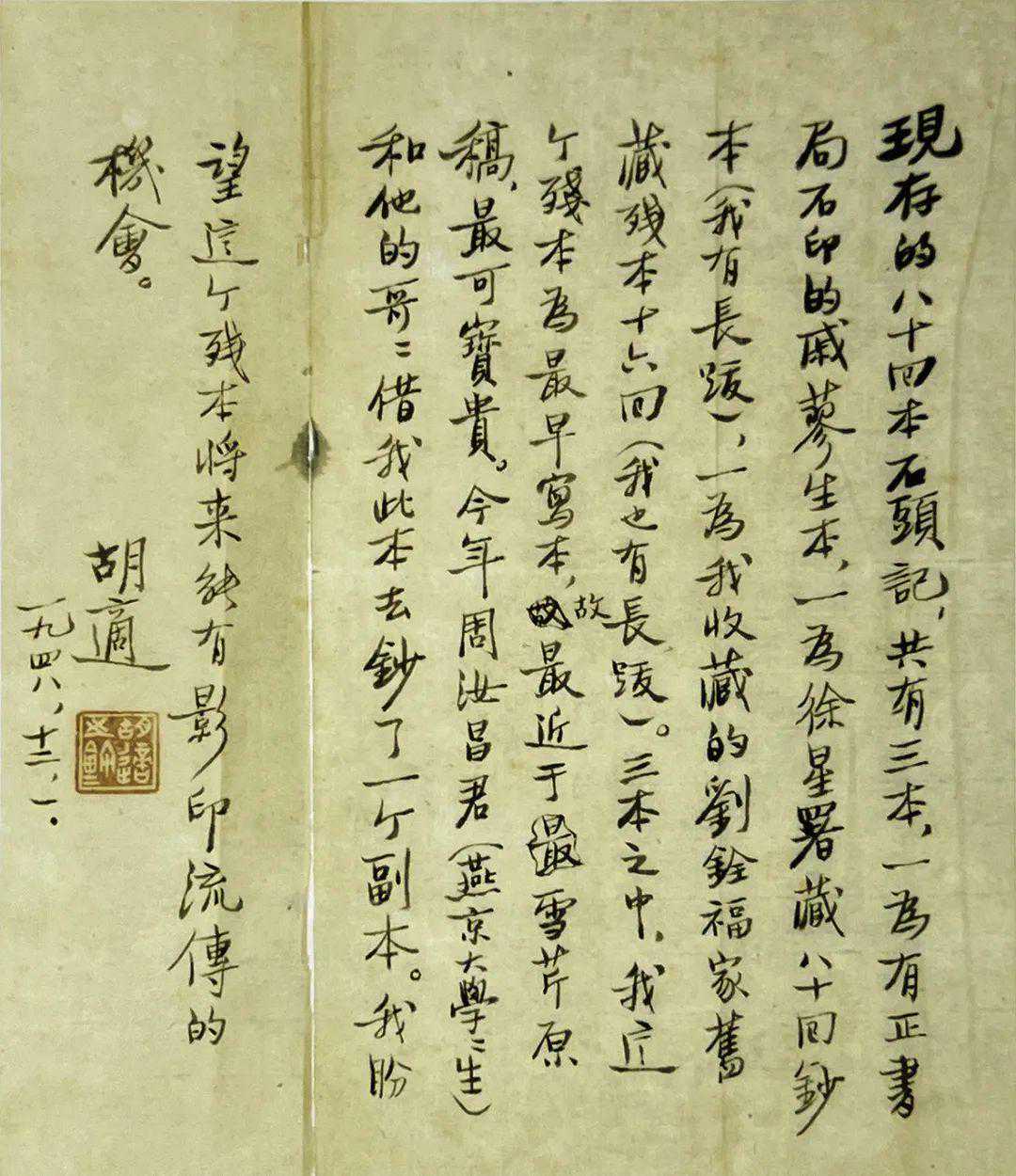 胡适还有一则长跋,“现存八十回本石头记,共有三本,一本为有正书局石印戚蓼生本,一为徐星署藏八十回钞本,我有长跋,一为我收藏的刘铨福家旧藏本十六回(我也有长跋)。三本之中,我这个残本为最早写本,故最近于曹雪芹原稿,最可宝贵。今年周汝昌君(燕京大学学生)和他的哥哥借我此本钞了一个副本。我盼望这个残本将来能有影印流传的机会。胡适,一九四八、十二、一。”