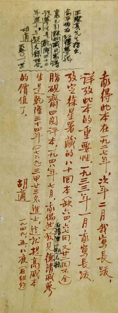 从1927年胡适购得乾隆甲戌本《脂砚斋重评石头记》,到1948年周汝昌借去抄了一个副本。在这20年里,除了胡适写了一篇《考证〈红楼梦〉的新材料》,很少有人提及这个“甲戌本”,也很少人看到过。胡适于1948年离开北京去南京时,只带了两本书,一本就是“甲戌本”,周汝昌没说另一本是什么书。实际上是胡适父亲的遗著清抄本。胡适看到叶恭绰把祖父、父亲的诗词整理刊印,即给叶写信说自己没能把父亲的诗词刊印,心中感到愧疚。