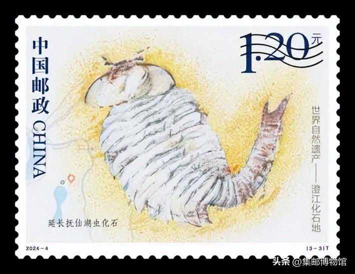 本套邮票第三枚的原型就是延长抚仙湖虫化石,它是节肢动物。节肢动物在澄江生物群300多个物种里面,有80多个,占比非常高。延长抚仙湖虫,它体态优美,因它整个身体的形状跟澄江地区抚仙湖的湖面的形状一致,由此得名。