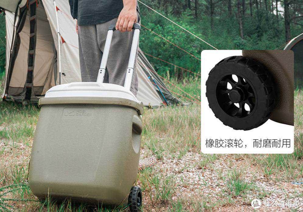 在使用的时候也不用担心放满食物或者饮品后,保温箱就太重了牧高笛的这款保温箱自带拉杆,下面有橡胶滚轮,一拖一拉轻松就拉走了,非常省力,而且有三层材质不仅保温,还抗压防摔,户外使用非常耐用。