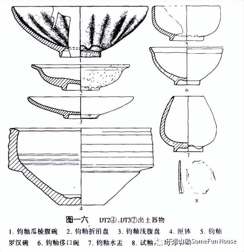 禹州城内制药厂后院即八卦洞附近,2004年发掘的T0417H1出土元代出戟尊、鼓钉洗、花盆、盆托等陈设用瓷,以及单把洗、高柄碗、碗、盘、钵等民用瓷。2004年发掘的T0501地层第3层为元代层,出土少量钧瓷碗、盘等,无陈设瓷。该层下面叠压4个灰坑,H68和H64分别打破H125和H200。H125和H200出土的白瓷碗底和外侧墨书:“正隆元年(1156年)三月初五日”,H68出土钧瓷盆、钧瓷盘、钧瓷洗等,H64出土钧瓷碗,两灰坑所出钧瓷的年代晚于1156年。地层3层之下4层、5层为宋代层,未见钧瓷器。