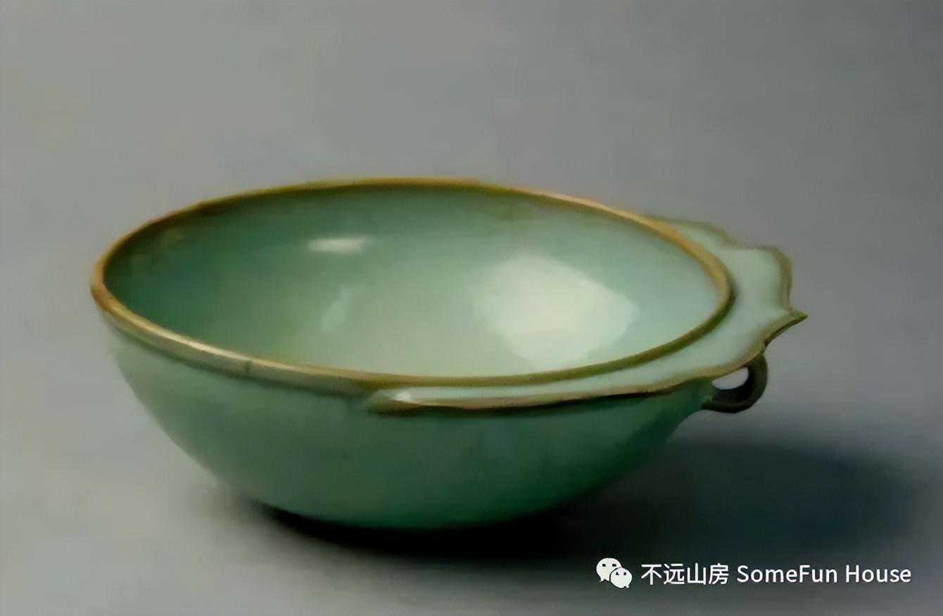 河南博物院藏金代钧窑月白釉荷叶形单柄杯,金代,高5.9厘米,口径17厘米,1980年嵩县城关镇北街砖厂出土。体呈6瓣荷叶式,口部微敛。口部一侧出葵式折沿,沿下附耳,耳与腹部相连。通体施月白釉,满釉支烧,底部有三支烧痕。