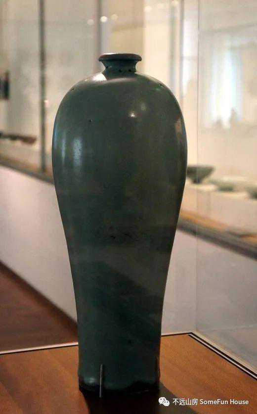 淄博市博物馆藏金钧釉玉壶春瓶,高27.3厘米,口径4.8厘米。敞口长颈,溜肩垂腹圈足。胎体较厚,通体施天蓝釉。