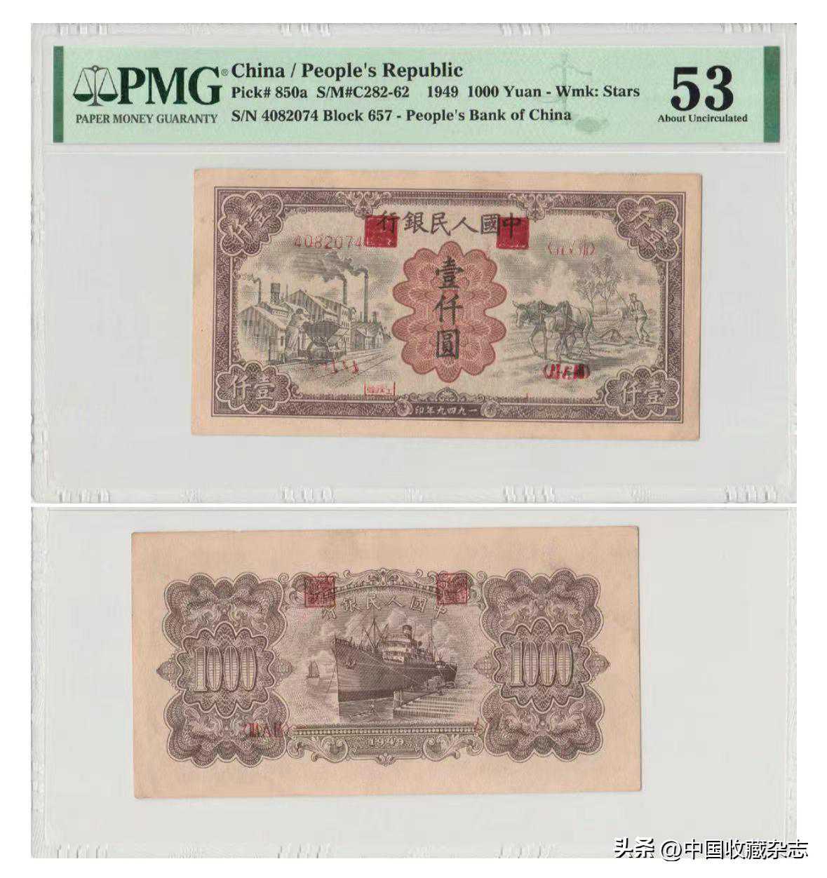 复打号码印章大错位,PMG53PrintingError标注印刷错误。此品在第一版人民币里属于中等编上的品种,加之近年来未流通的原票状态,以及因印刷厂疏失而造成的错版,使其成为值得珍藏的藏品。